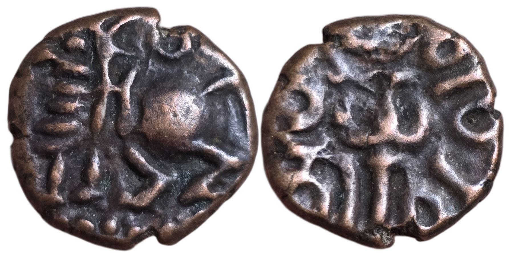 Vijayanagara- Devaraya, AE Unit, 2.41 g, 13.22 mm. Obv: Bull facing left with a crescent on top. Rev†Kannada legend “Sri (de)va/raya†with a dagger in the centre and shankh,chakra flanking on either sides of the dagger. Studies in Vijayanagar Coins, K.Ganesh, # 61. VF, scarce. Estimate: $ 50-60
