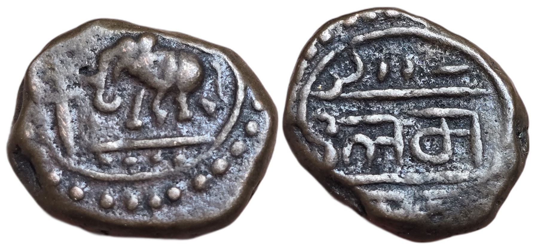 Vijayanagara- Tirumalaraya. AE Unit, 3.61g, 14.86 mm. Obv: Tusker elephant advancing to left with a dagger infront of it. Rev: Nagari legend “Sri Ti/ru/Mala/Raja†in 3 lines separated by horizontal rulers. Studies in Vijayanagar Coins, K.Ganesh, # 285. VF ,Scarce. Estimate: $ 60-80