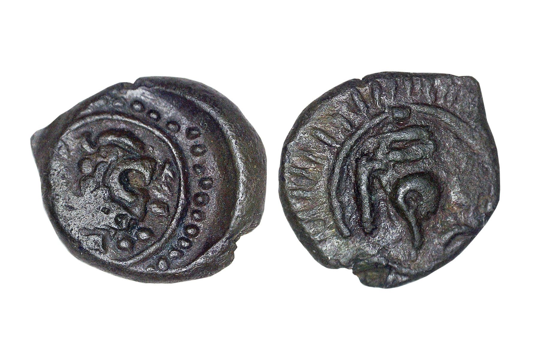 Vishnukundin, (c. 420-624 AD), Andhra region, Copper Half Unit, 1.70 grams, Obv. Stylized Lion standing to the right within a circle with a dotted border, Rev. Shankh (Conch-shell) between 2 Lampstands, one on either side, within a circle with rays, Extra Fine, Scarce.