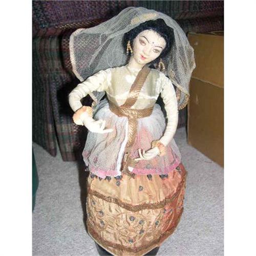 This doll is 13" with the wooden base. The doll is nailed to the wood and there is a split now in the base. The doll has a molded cloth face with painted features. She has a red dot in the center of her forehead and red sots around the eyes. She has two black beauty marks on her face. One on her cheek and one on her chin. Maybe they are tatoo marks also. She as red tatoo dots on her fingers and there is a red line across the fee up by the toes and red dots behind it across the width of the foot. She has red painted toenails. She has no shoes. I'm guessing she is a bride as she has a net veil. The dress is rather fancy but has seen better days. It is faded and there are a couple of brown specks on the bodice. There is light surface soil to the doll. She has well molded breasts and individually formed fingers. She has black mohair for her wig. The bottom part of the dress is attached to a cardboard form. Again there is fading and some sequins are missing. Beads are attached to the one layer of net falling from the waist. Some of the gold trim is pulling apart especially in the back. If she were as she came she would be spectacular but we will have to settle for how she is now. If you can still appreciate her beauty, please bid. She is from a smoke free environment. Buyer to pay $15 for U.S. shipping, insurance, and handling. Thanks for viewing.
