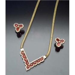 Indian 22-Karat Yellow Gold, Ruby and Diamond Three-Piece Ensemble Consisting of: a single line 'V' necklace set with nine oval faceted rubies weighing approximately 3.60 carats flanked by sixty-six round brilliant cut diamonds weighing approximately 1.35 carats, a pair of matching pierced earrings each set with 3 oval faceted rubies weighing approximately 1.20 carats surrounded by twenty-five round brilliant cut diamonds weighing approximately .50 carats, together with original blue velvet and satin-lined fitted presentation box. Total weight of rubies: 6 carats Total weight of diamonds: 2.35 carats Length of necklace: 15 in (38.7 cm) $1,500 - $2,000
