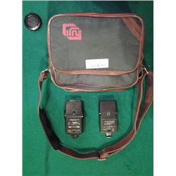Fuji 35 millimeter camera with Talus voted lens to computerized flashes with clip case and studying pod.