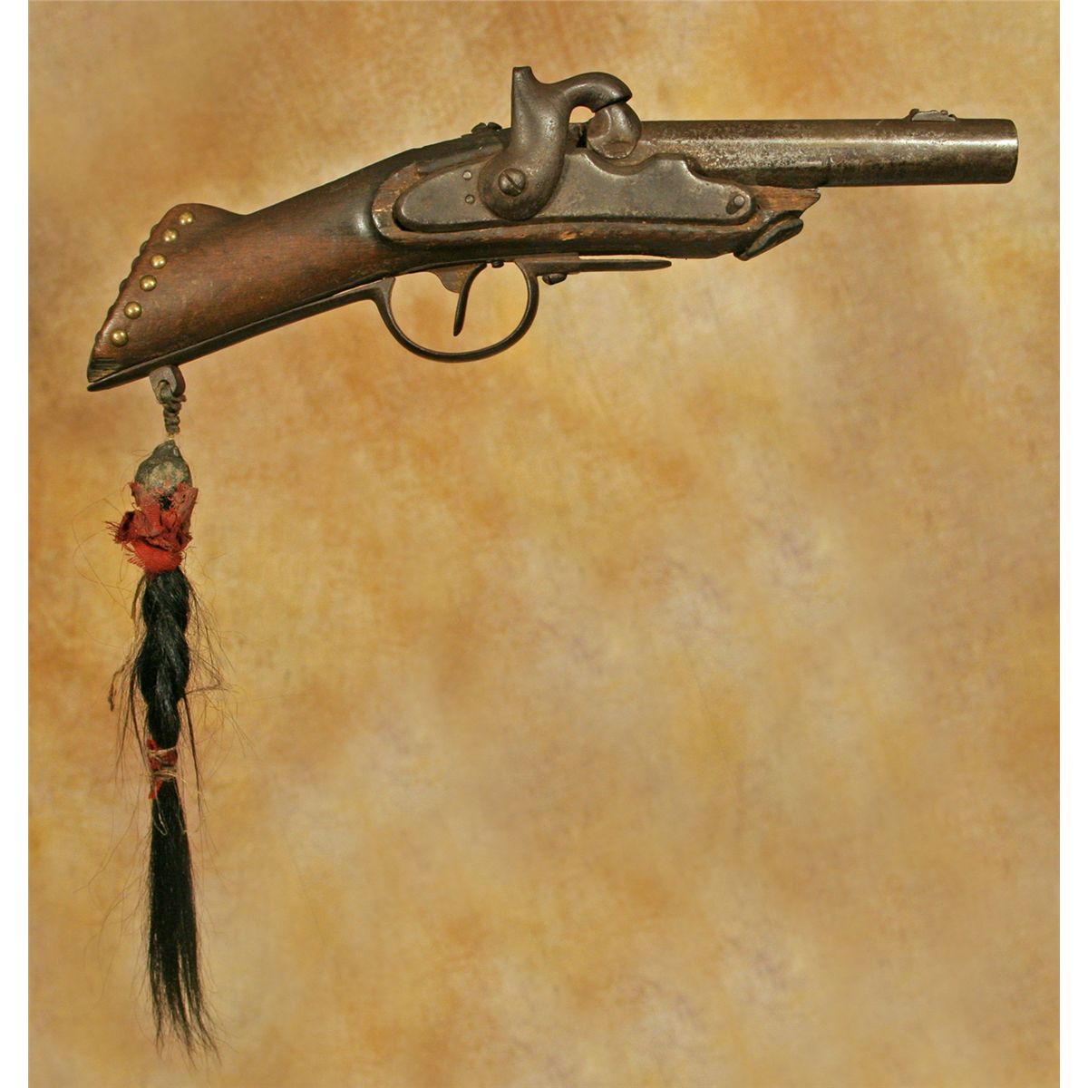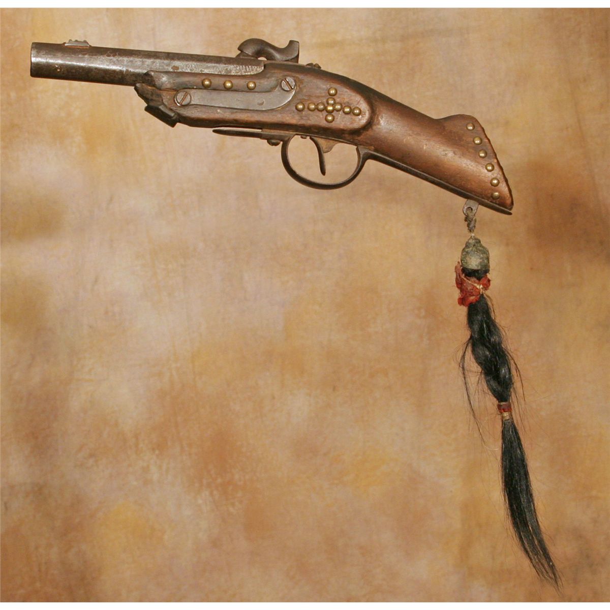 Indian Blanket Gun. 15" long. Cut down from a foreign musket to a "pistol" that could easily be hidden under a blanket on horseback. Tacked around the grip, then in a cross and line pattern on the left side only. Decorated with a 10" braided human hair drop. RARE!!!! 19th century.
