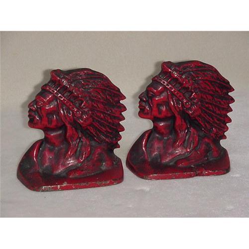 A pair of iron bookends, 5" tall, 5" wide. Modeled as indians in full headdress. Made in the early 20th century and unmarked. A handsome pair and a great addition to a bookend collection. (10)