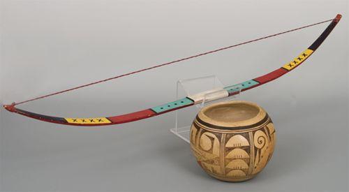 Hopi Pueblo Indian Bow Together with Hopi Pottery Bowl. (1) Bow is 35" long. Multicolor paint. Fine condition. (2) Bowl is 5 ½” x 6 ½”. Signed Patti Maho (1903-1993). Pot shows some use but fine condition. (est $400-500)