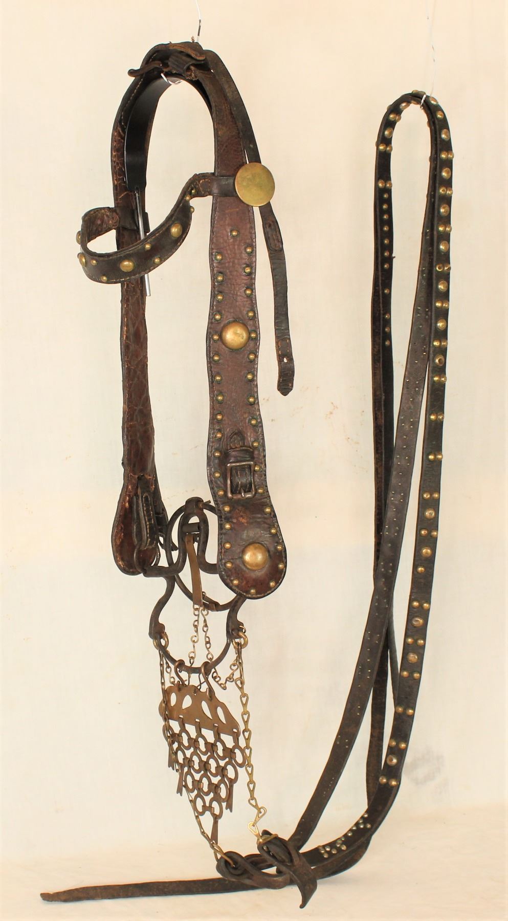 Beautifully presenting wide cheek bridle covered in brass studs including long leather reins, topped off with an amazing iron ring bit with brass linked drop.