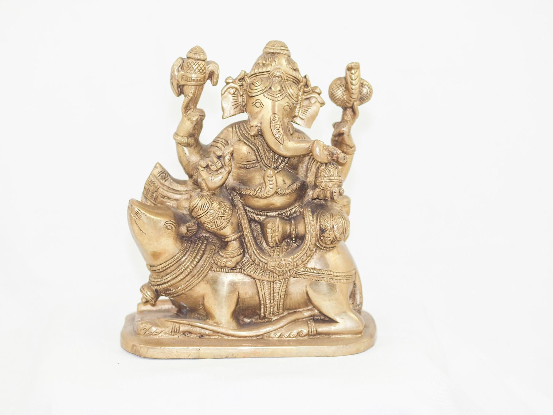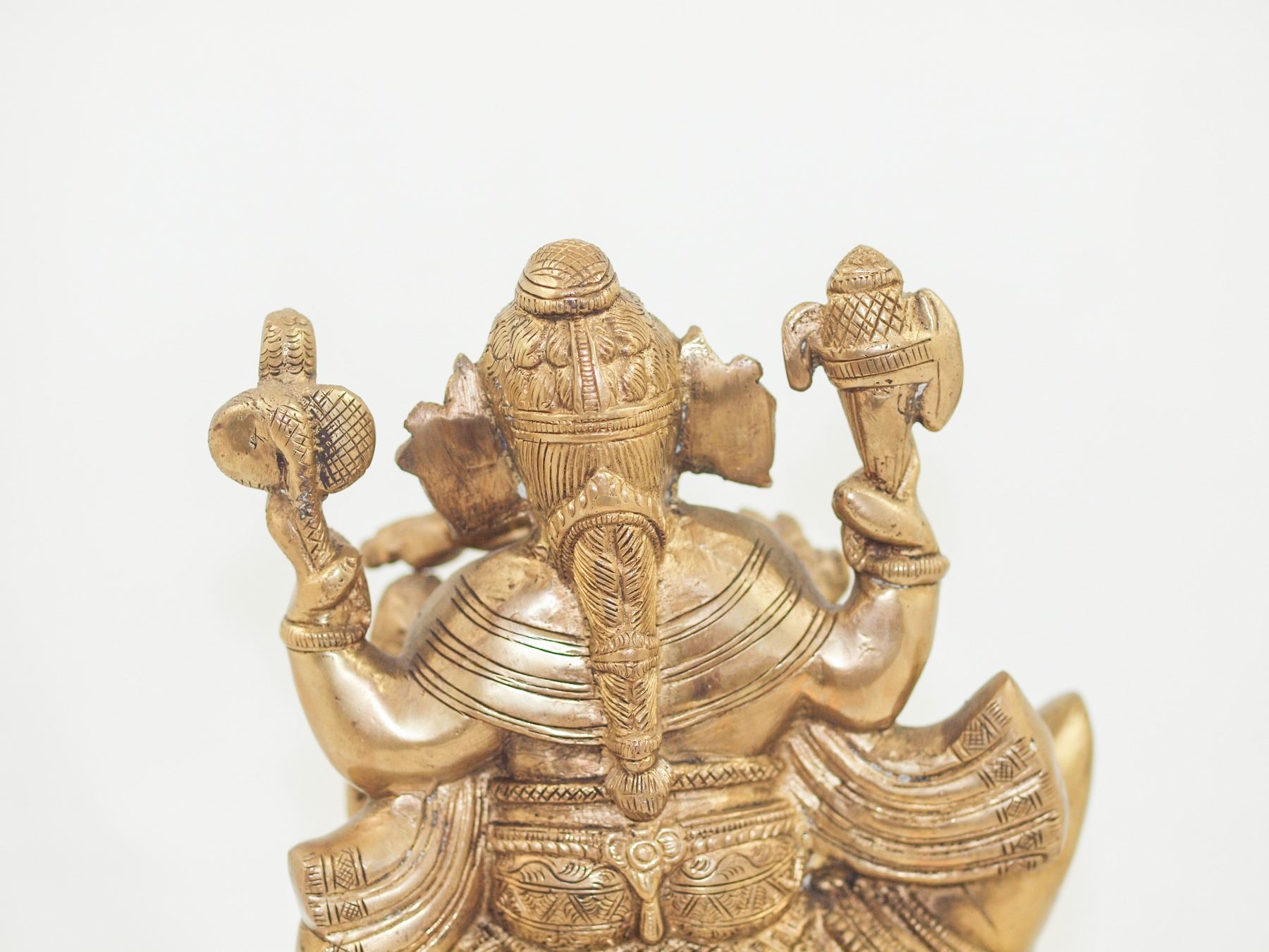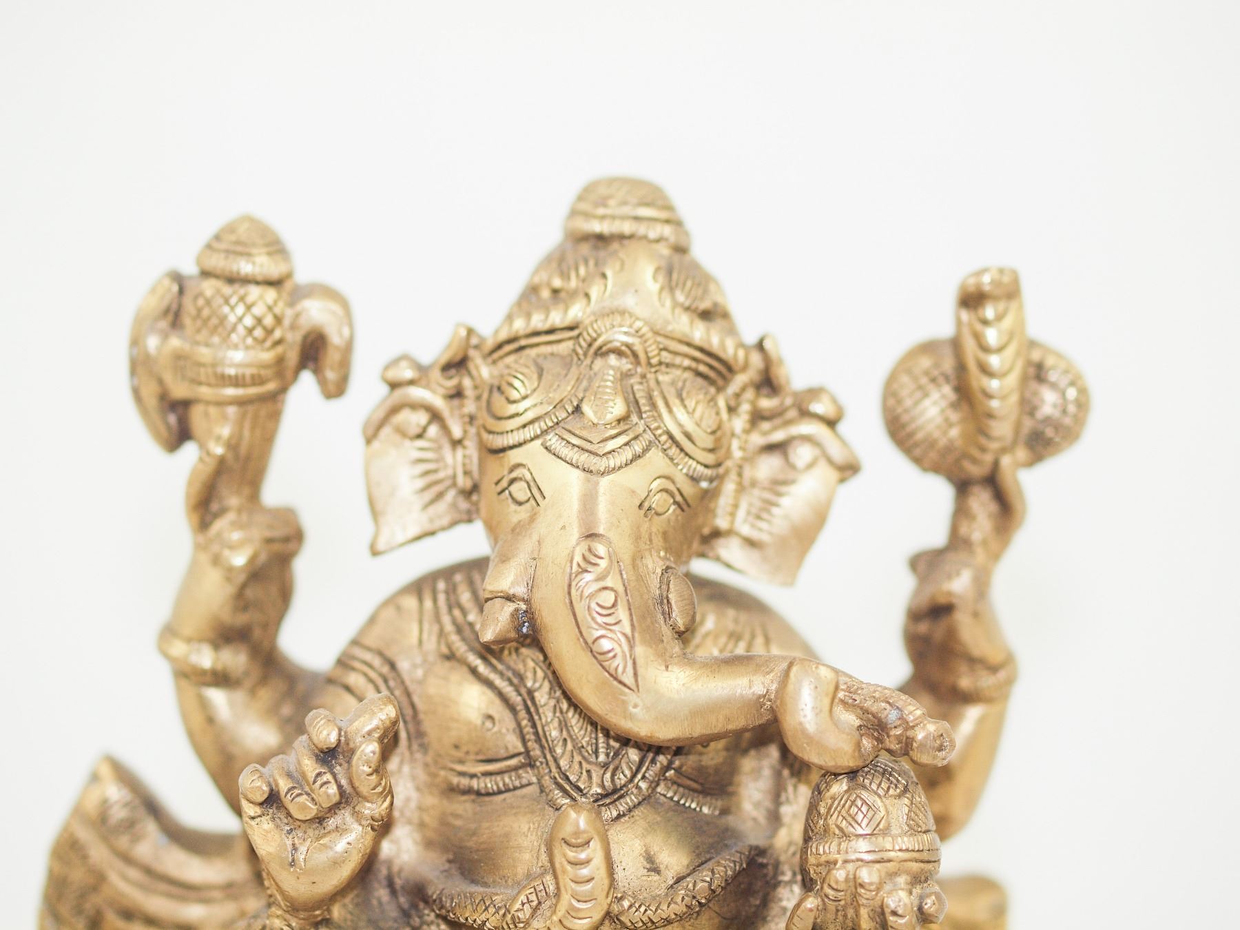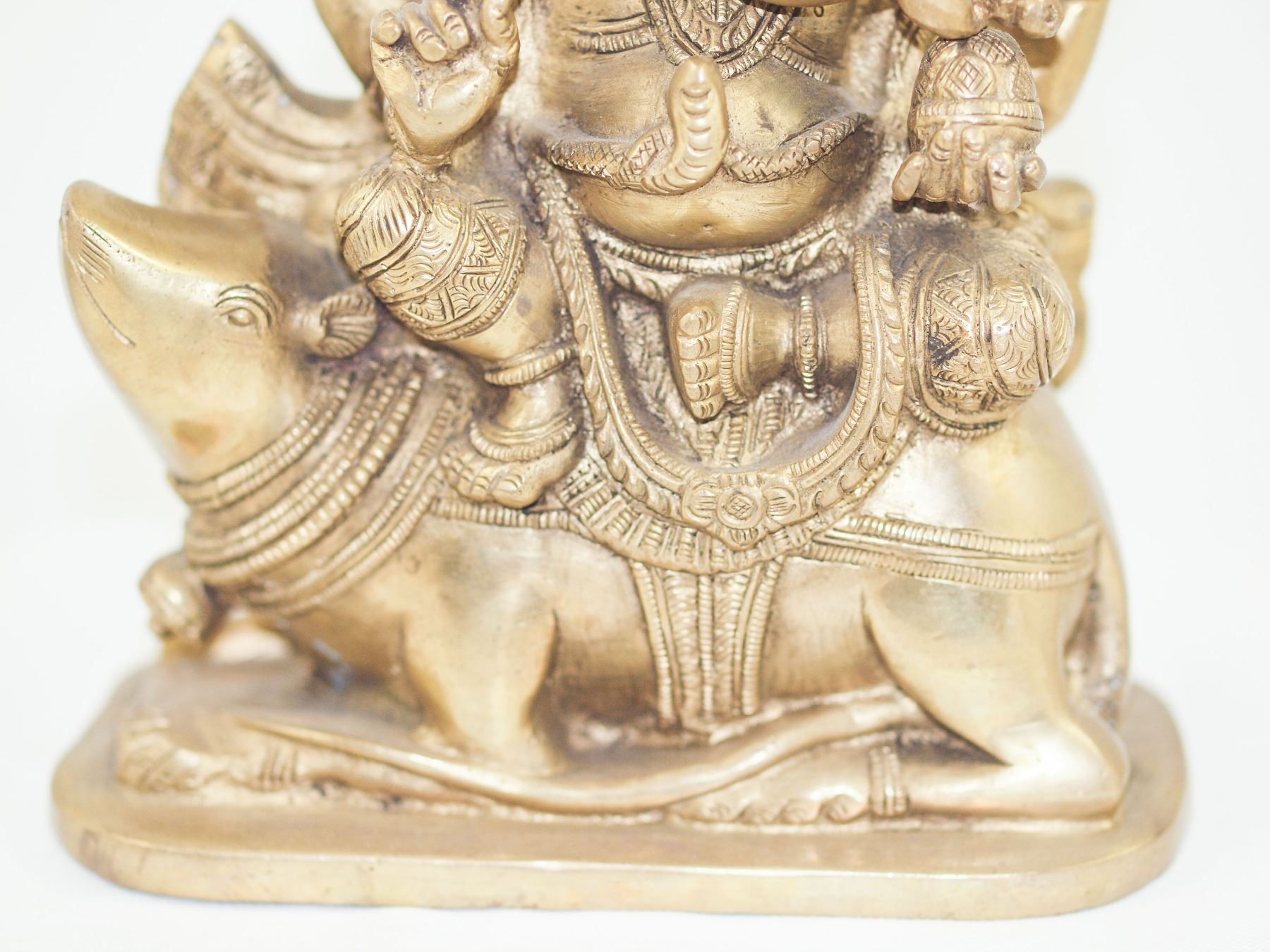 Indian bronze figure featuring Ganesh firstborn of Shiva and Parvati, represented with the head of an elephant with a broken tusk, protruding stomach and four arms. He is seated on a mouse in the position of Lalitasana typical of people owning virtues of quiet, regality and nirvana. Ganesh or Ganesha is one of the most important induist Gods and represents the perfect balance between male energy (Siva) and female energy (Shakti). 21 x 18 x 9 cm (8.27 x 7.09 x 3.54 inches), 3.63 kg. PROVENANCE: Private collection, Italy