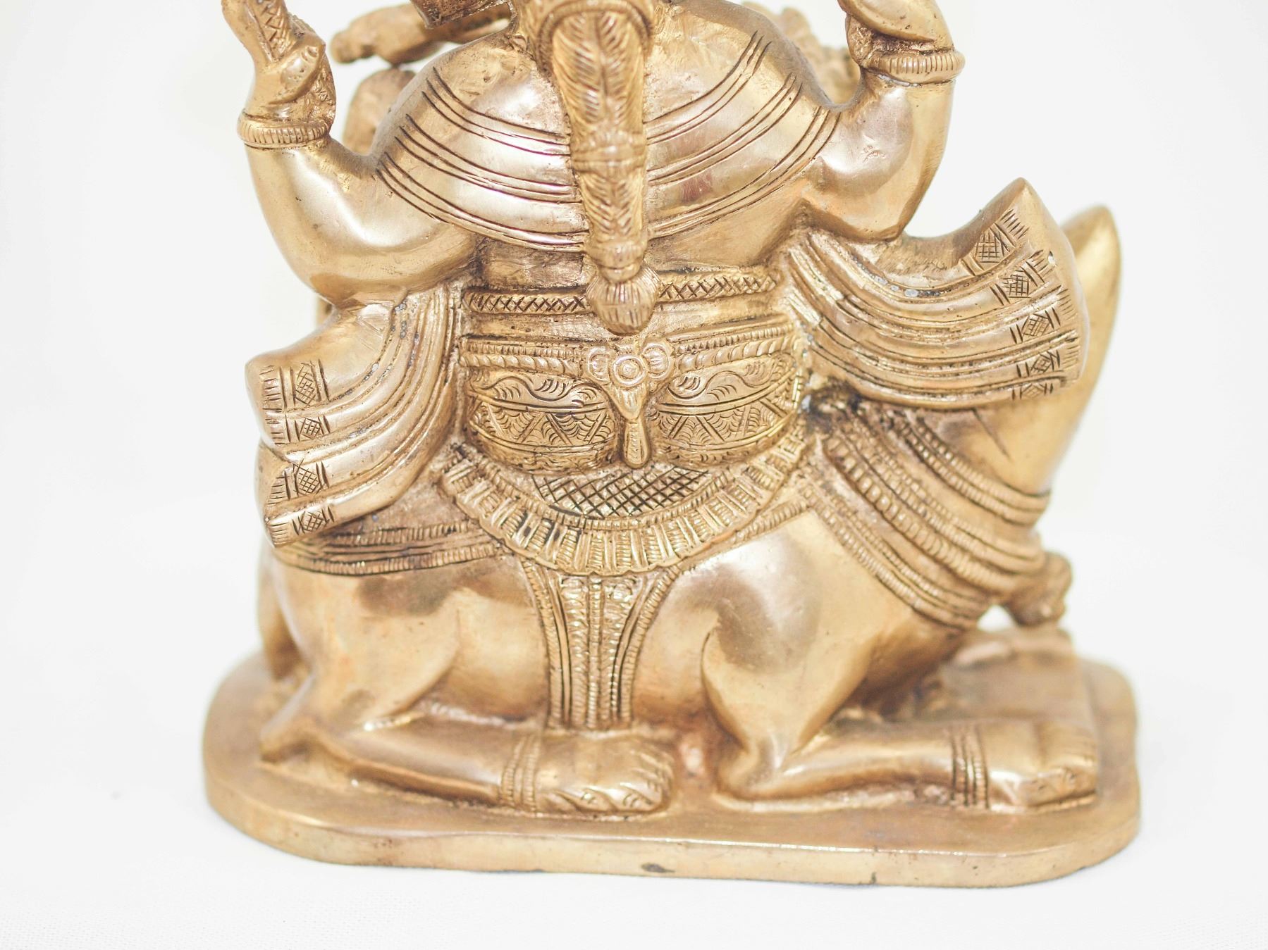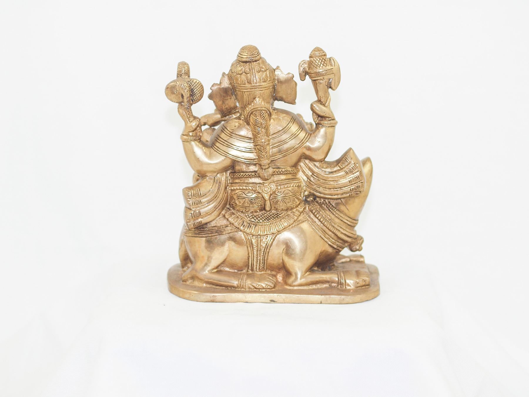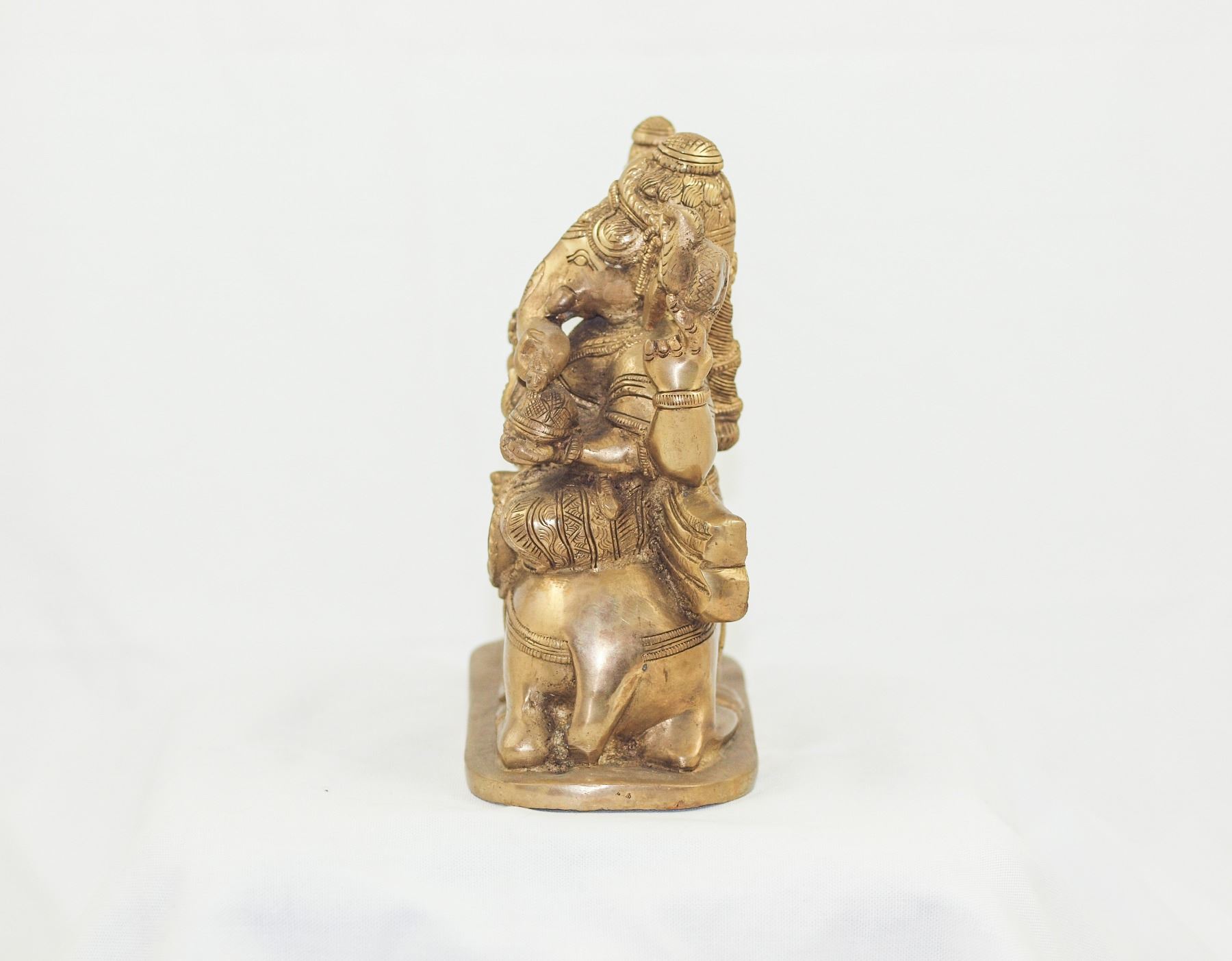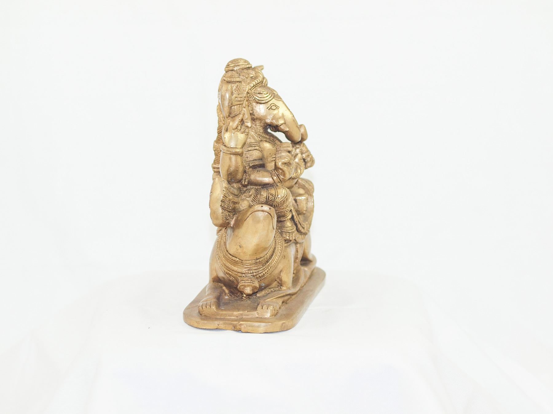 Indian bronze figure featuring Ganesh firstborn of Shiva and Parvati, represented with the head of an elephant with a broken tusk, protruding stomach and four arms. He is seated on a mouse in the position of Lalitasana typical of people owning virtues of quiet, regality and nirvana. Ganesh or Ganesha is one of the most important induist Gods and represents the perfect balance between male energy (Siva) and female energy (Shakti). 21 x 18 x 9 cm (8.27 x 7.09 x 3.54 inches), 3.63 kg. PROVENANCE: Private collection, Italy