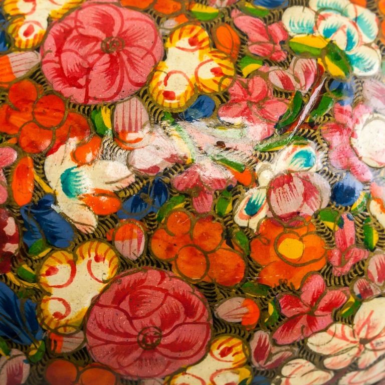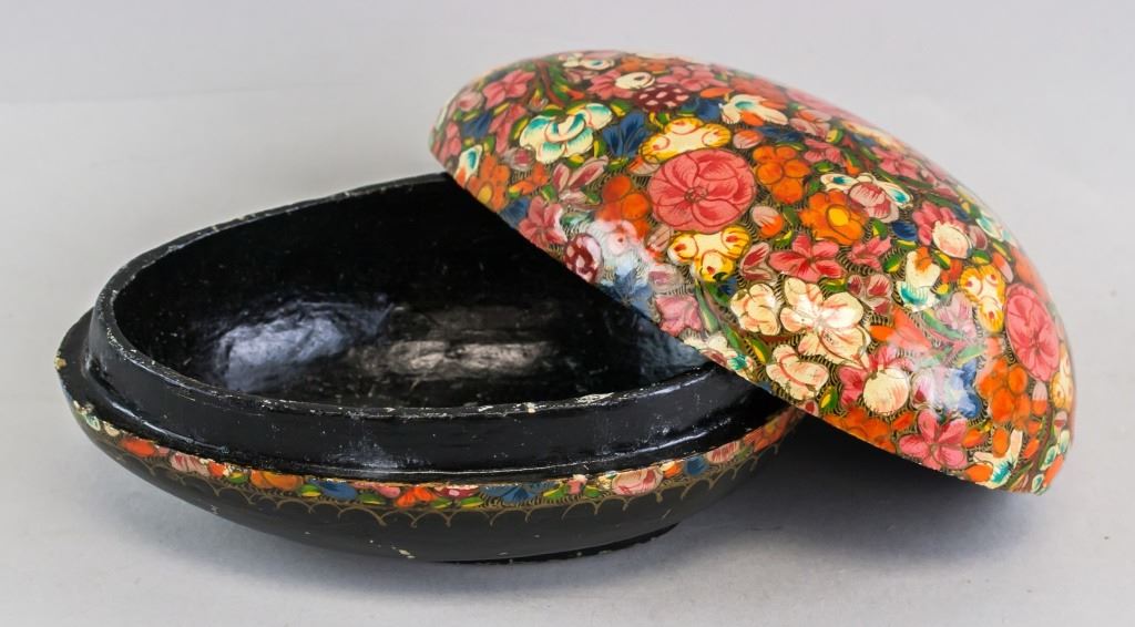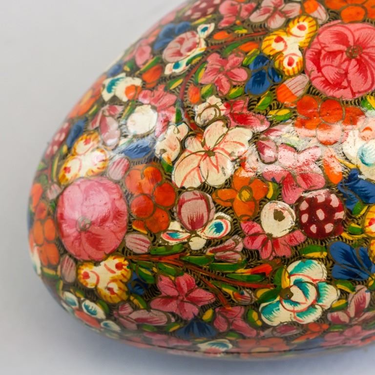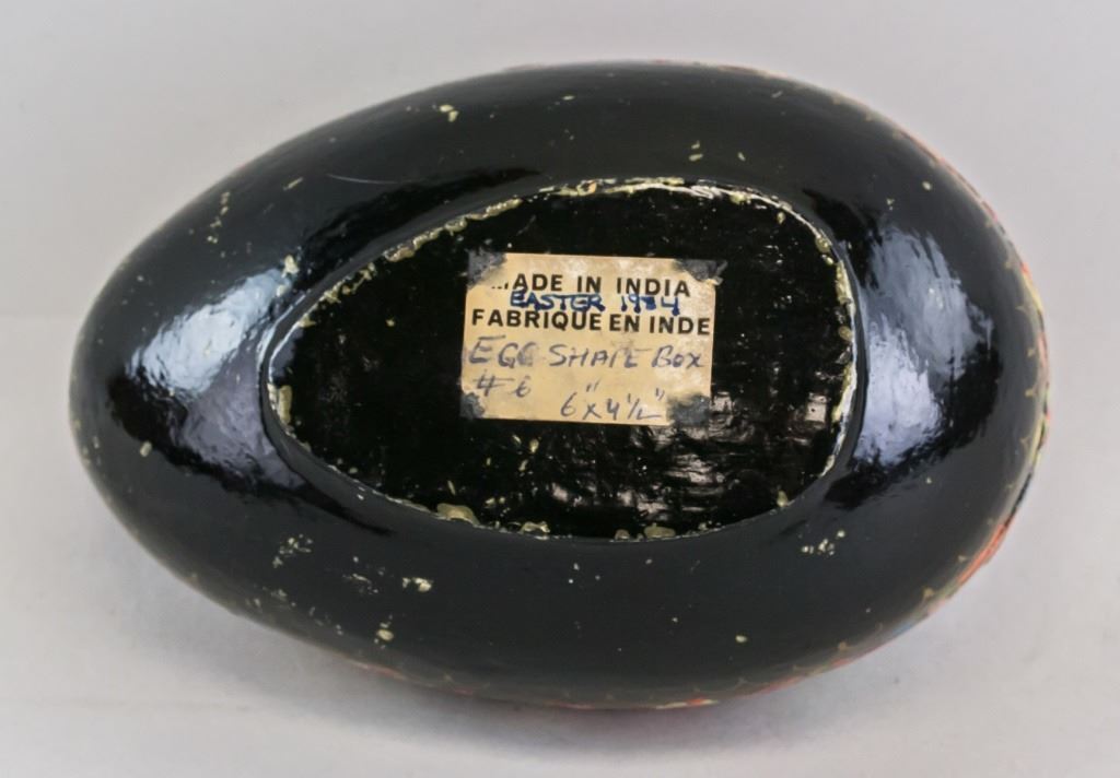 Indian cloisonne case. Painted with brightly colored fours. "MADE IN INDIA", "EGG SHAPE BOX", "EASTER 1984" inscribed on sticker on base. 10 x 16 cm. 159 grams.