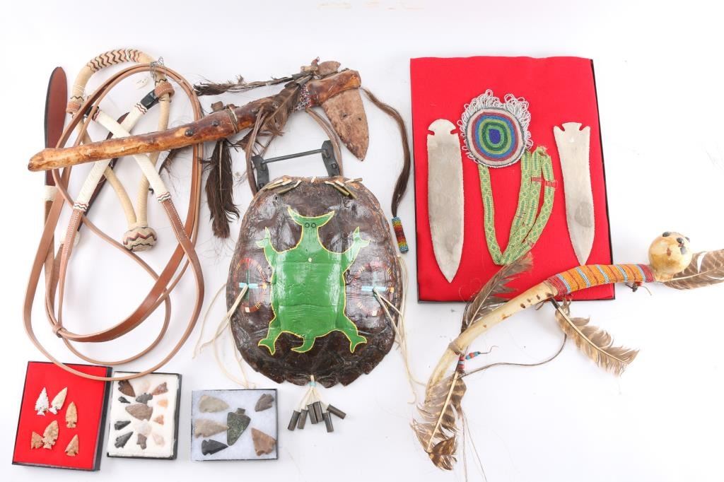 Ceremonial Native American tomahawk with chipped stone head and hide wrapped and studded shaft. painted turtle shell shield. Pewter drops and feather with multi-colored beads at top of shaft. Good quality for indigenous use at dance or Pow-Wow. 30-60 years old. Plus hide over wood skull crusher with beads and feathers. Braided leather bozelle. In very good condition and a decorative horseshoe wall hanging. 20+ indian points. A bonanza lot great for dealer or decoration.
