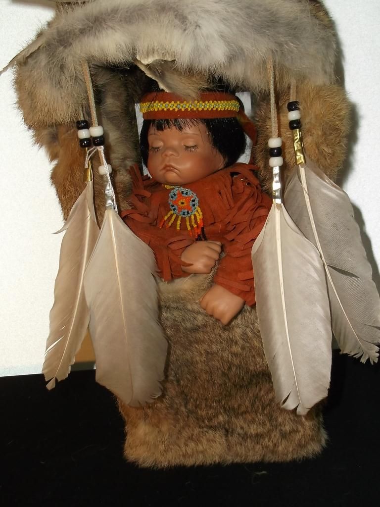 Kathryn J. Minton lived in Oklahoma City, she passed away in 2010. This wonderful 18” x 7” x 5” wood cradle is rabbit fur covered. The Native American sleeping doll is tagged, ‘Reproduction Dolls by, Kathryn J. Minton Oklahoma City, OK’. Don’t miss this collectible doll!