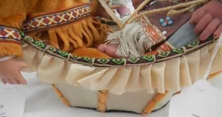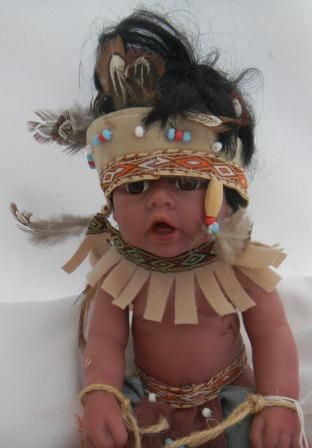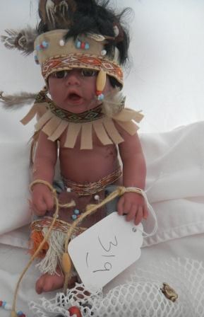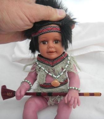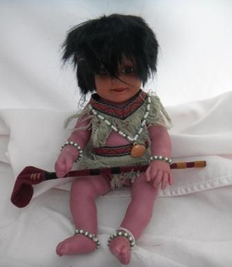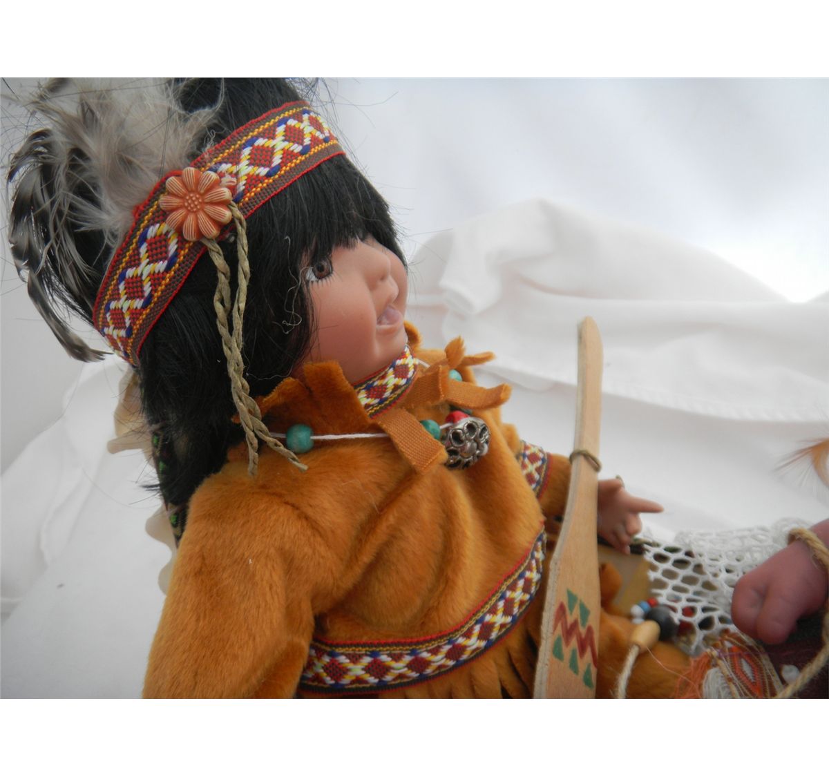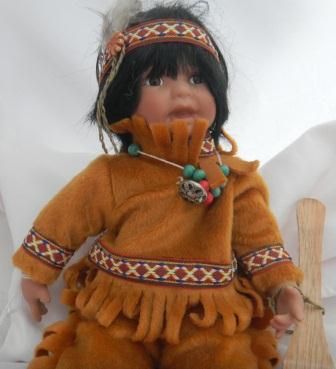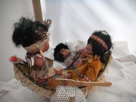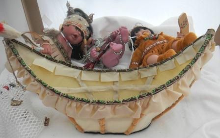 Three small Duck House Designer Indian Dolls. Two of the dolls are sitting in a canoe, one has paddle, the other had fishing net with fish!. Check out the bead work, the cute headbands. The dolls all measure approximately 8 1/2 to 9" long and about 5 to 6 inches wide. The canoe is 13 inches long, 5 inches deep and 5 inches wide. Shipping $20.00 Good Condition