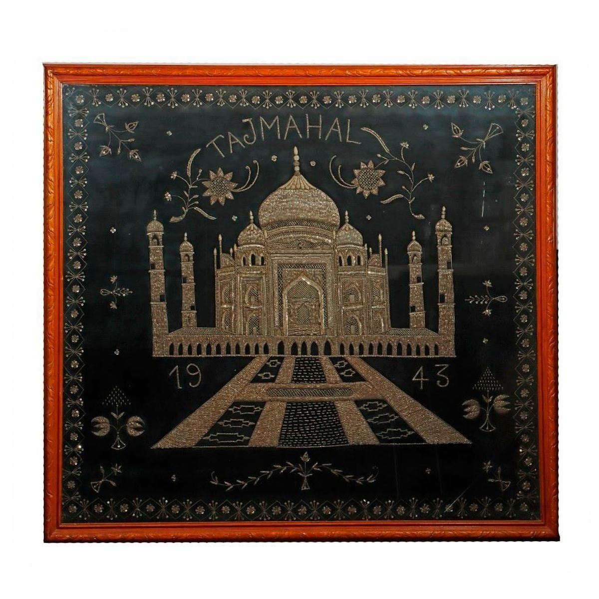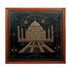 The image of the Taj Mahal embroidered in dense silver thread on a velvet ground within a floral border, dated 1943. Framed: 45in. w. 43in. h. Condition: Very good.