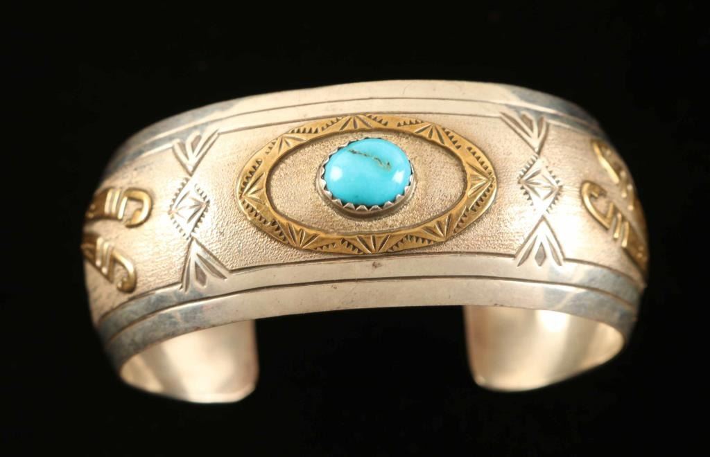 with single turquoise cab maker marked "VR" with gold overlay design, 6"gap 1 1/8"- 71/8" 26.5g.