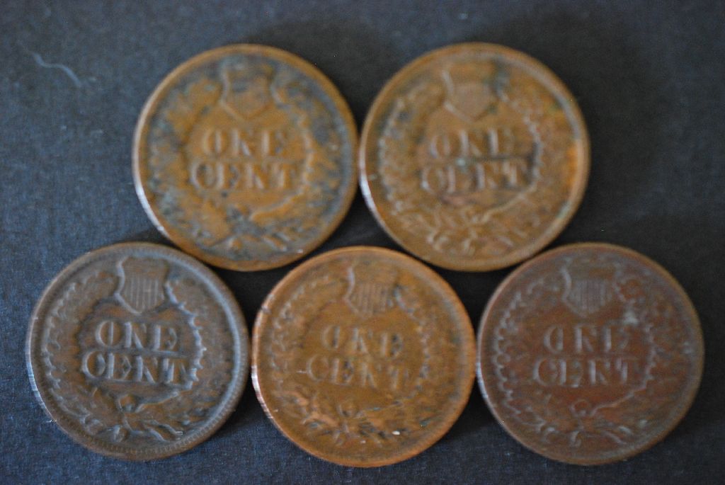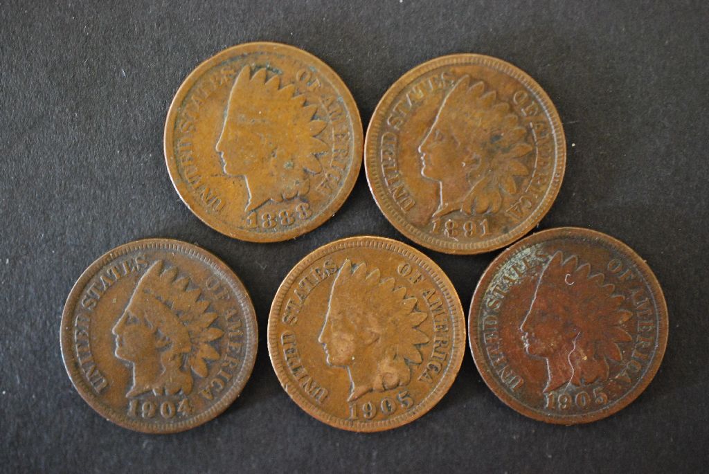 Indian Head One Cent; Various Dates & Conditions; Lot of 5