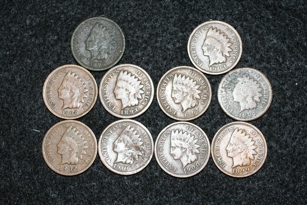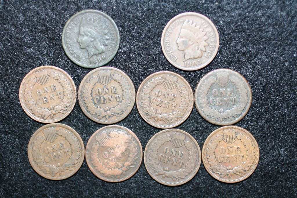 Indian Head Penny, various dates & conditions, lot of 10