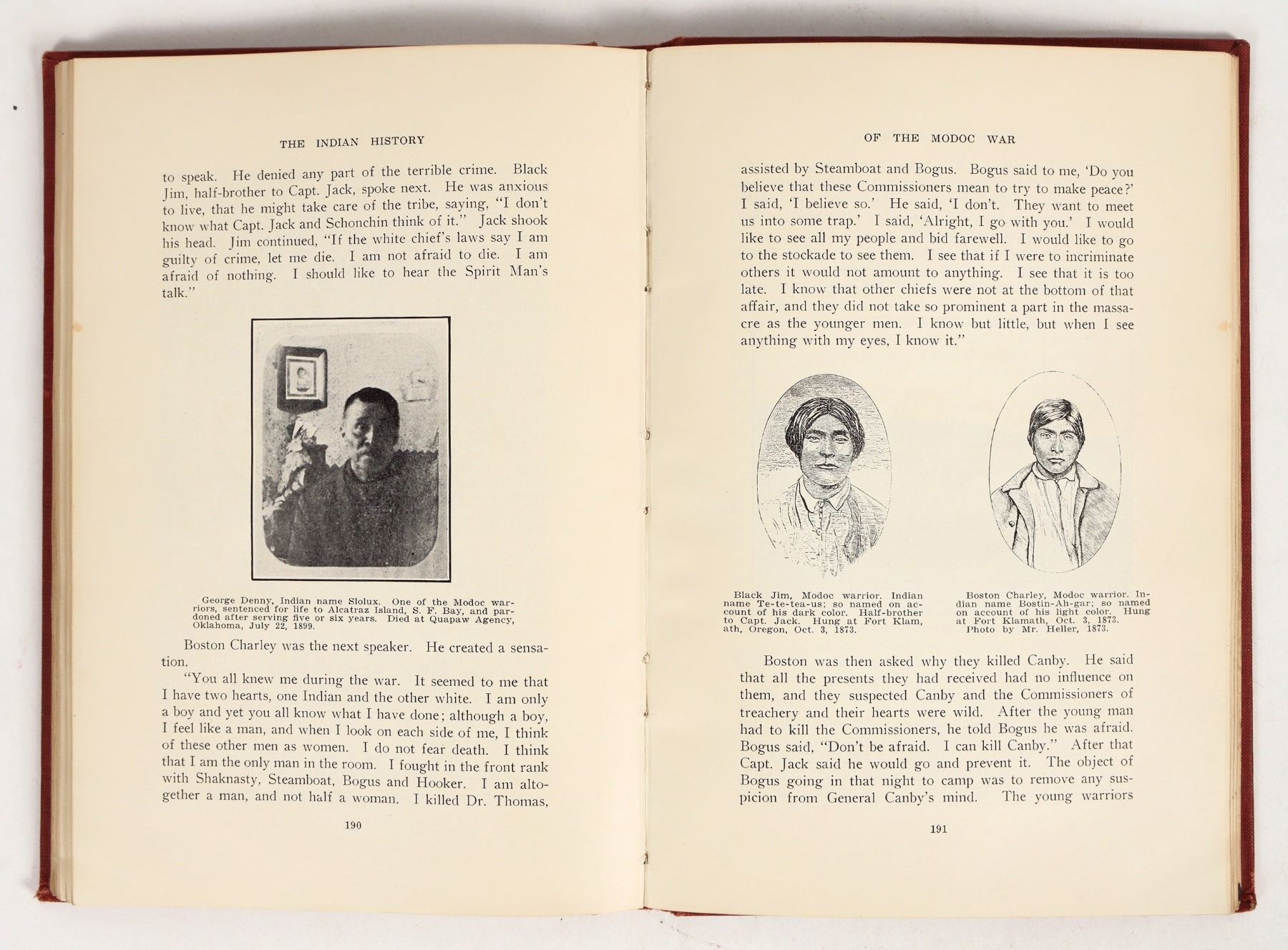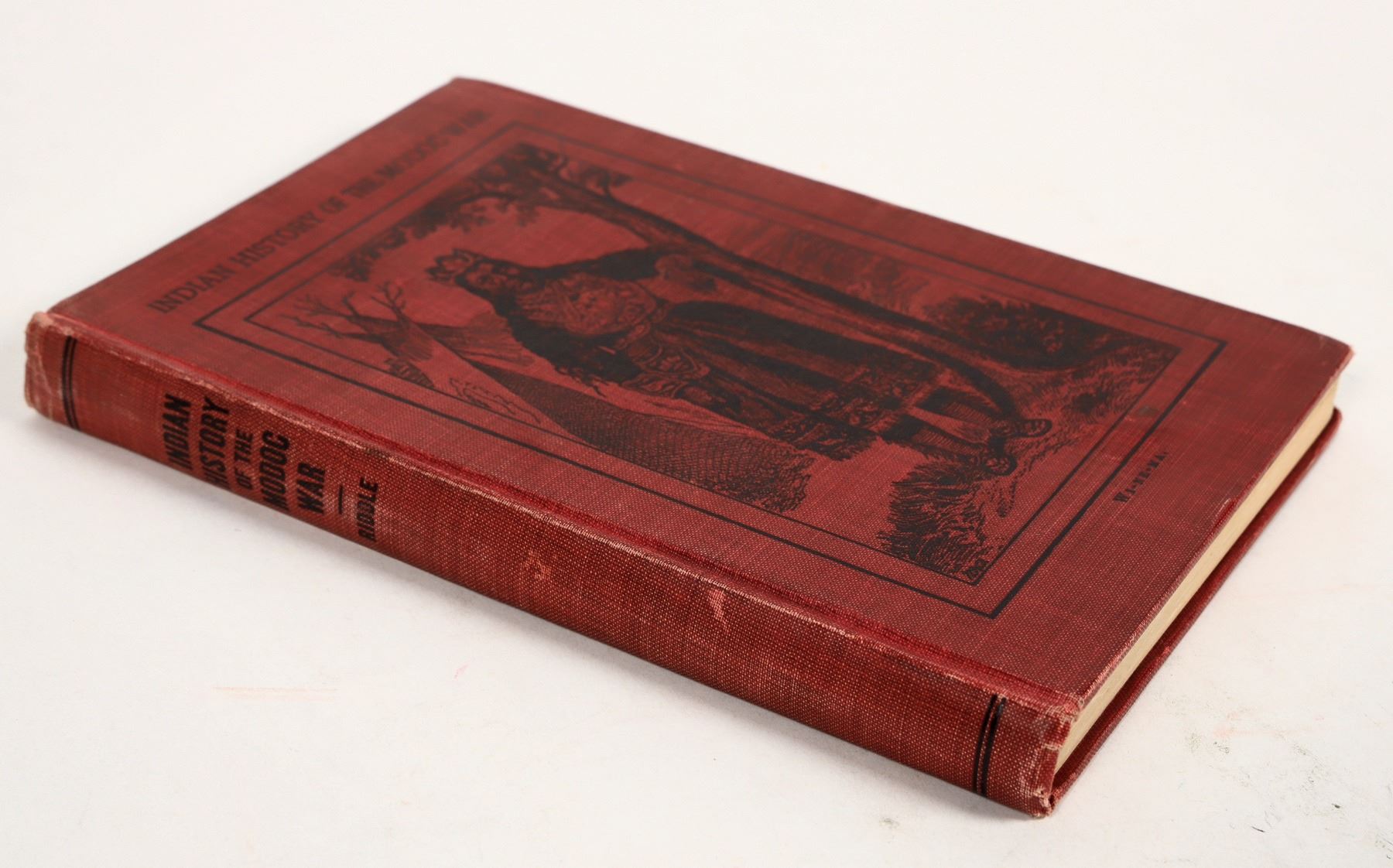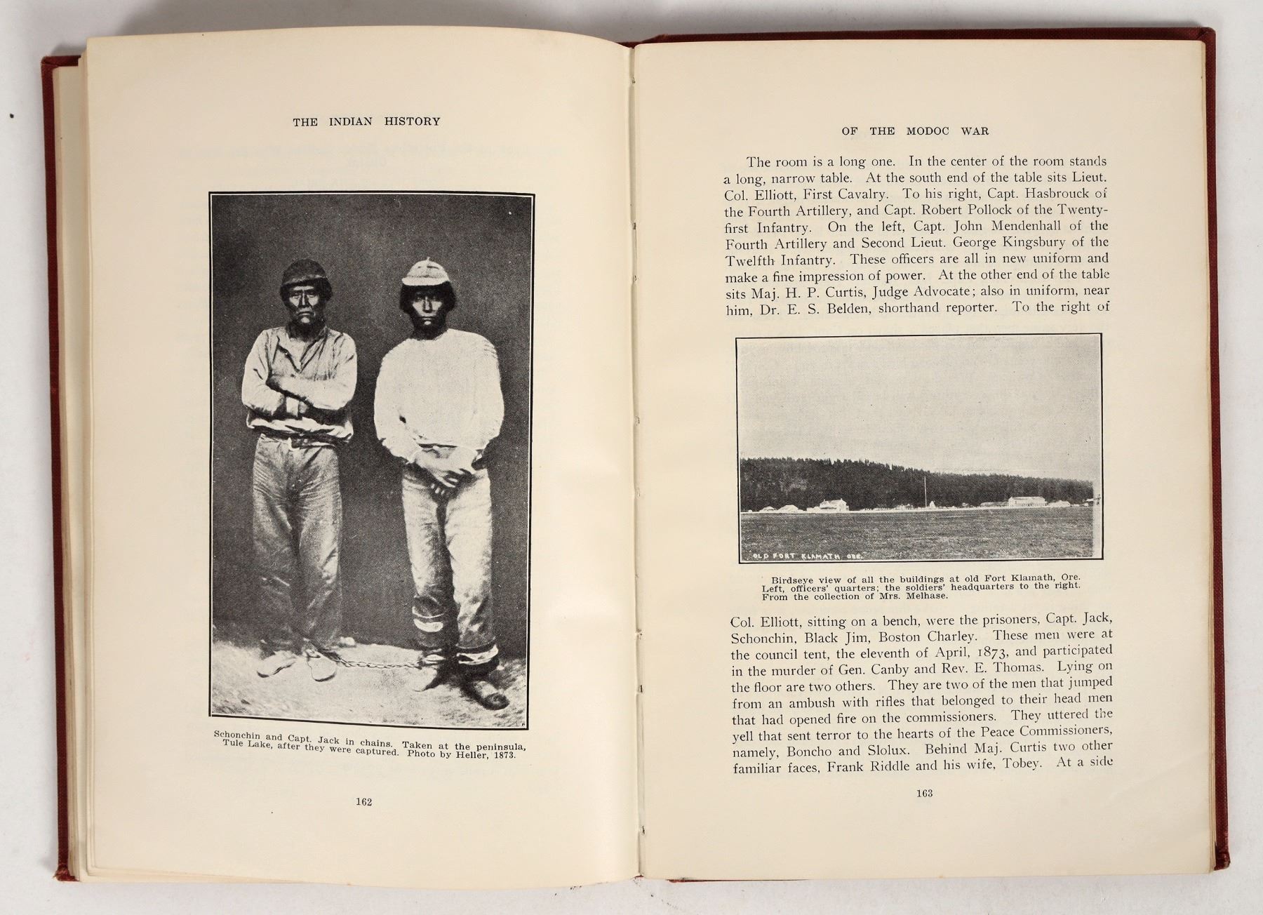 A copy of "Indian History of the Modoc War" by Jeff C. Riddle, published 1914. Riddle, who was born to a Modoc mother and a white father, presents a unique and nuanced view of the war, in which his mother Wi-ne-ma was a prominent figure. Hardback, 295 pages, original red fabric binding with illustration of Wi-ne-ma on cover. Illustrated throughout with photographs, good condition.