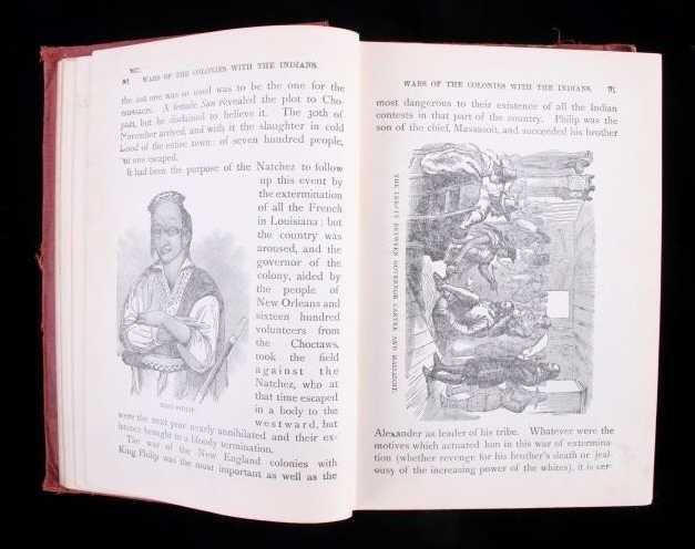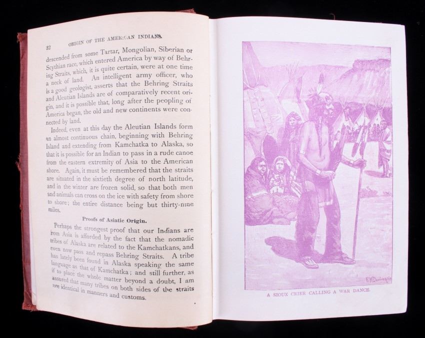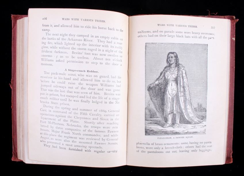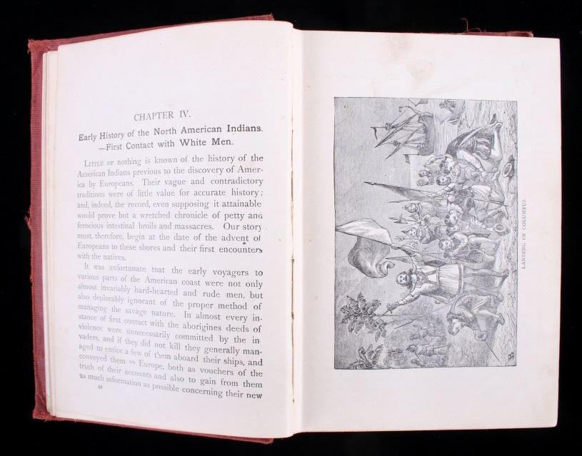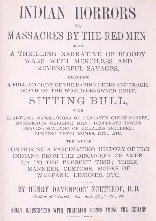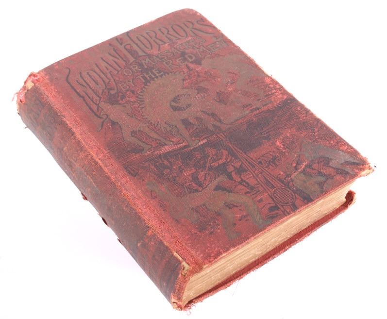 This is "Indian Horrors or Massacres by the Red Men" by Henry David Northrop published circa 1890. The book features a beautifully illustrated and gilt decorated cover and spine. The book provides riveting narratives of various conflicts up through the Indian wars of the 1880's. There are numerous illustrations throughout as well as images of Native Americans such as Sitting Bull, Plenty Scalps, Standing Bear and many more. The book shows good overall condition, with some obvious wear to the corners, and bidning. It measures 5.25" x 7.75".