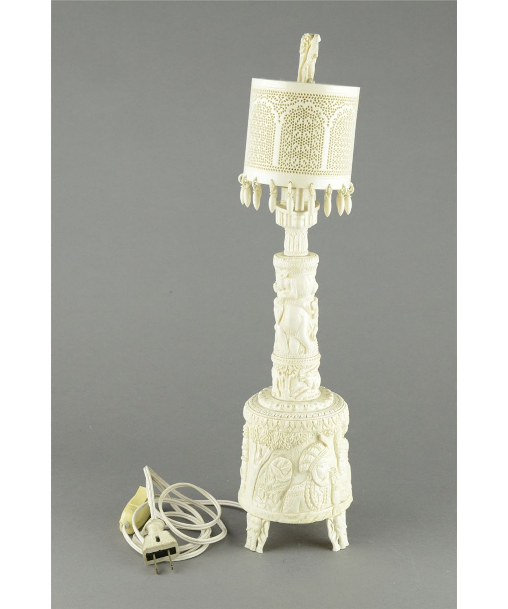 Slender and heavily carved, the ivory lamp is richly decorated with exotic animals, palace and royal couples glazing each other. Topped with an intricate open work reticulated shade. H: 44 cm, D: 8 cm, 737 grams.