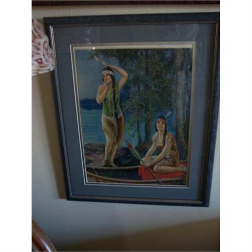 Another beautiful Indian Maiden's print called "Abscence Makes the Heart Grow Fonder" by Charles Relyea.You can not read this on the print but I found the info in the Vintage Illustration book by Rick & Charlotte Martin.Beautiful colors and this one is double matted.The part of the print that is showing measures 15 3/4 x 11 3/4.The entire frame measures 21 3/4 x 18.I had these framed in 1999.Beautiful blue marbelized frame that looks great with the colors in the print.