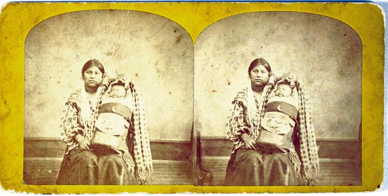 An unidentified photo of a young Indian mother seated, holding her baby in a cradleboard on her lap. There is no identification of tribe, date, photographer or publisher. A note on the reverse reads: The chain hanging around the child’s neck is a bear’s tooth which is for the child to cut teeth with. No doubt our Mothers gave us a silver piece. In faint pencil on the reverse is “The Squaw.” Faded, fair contrast, yellow matte. 3.5 x 7."