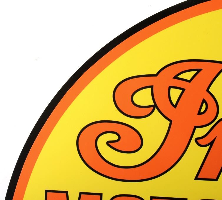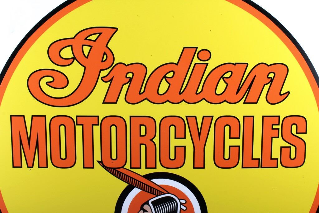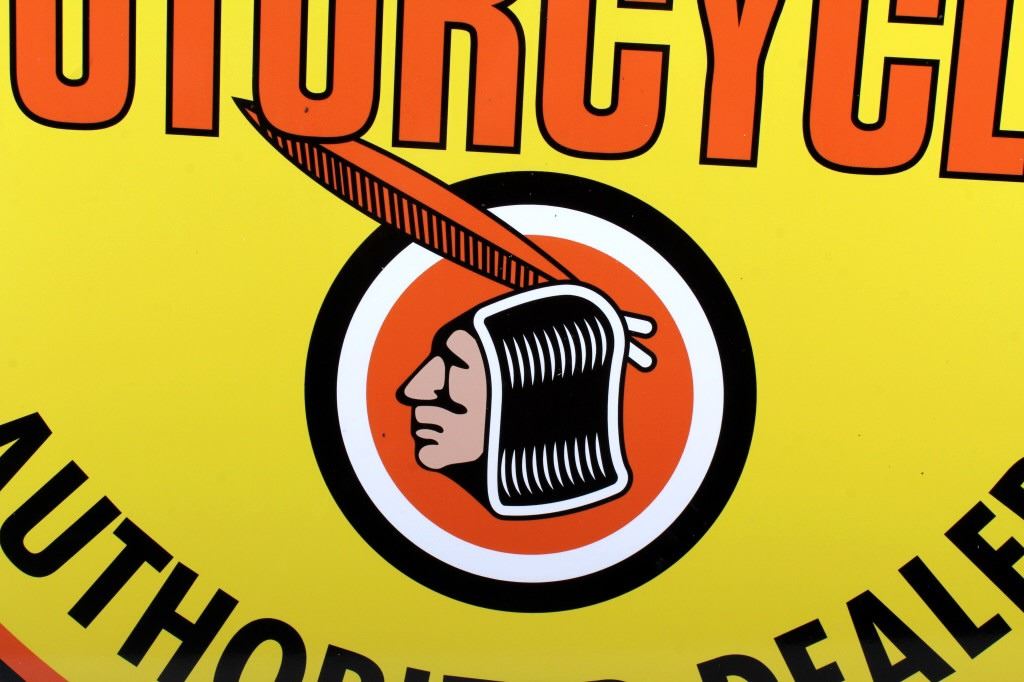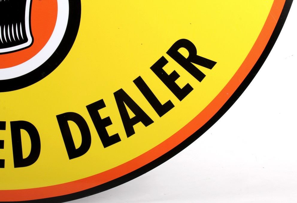 Included in this lot we have a Indian Motorcycles authorized dealer advertising sign. The sign displays sharp graphics and shows the Indian Motorcycle Hendee logo. The sign is made up of yellow, orange, black, and white coloration. This modern sign is in good condition overall. It measures 35" in diameter.