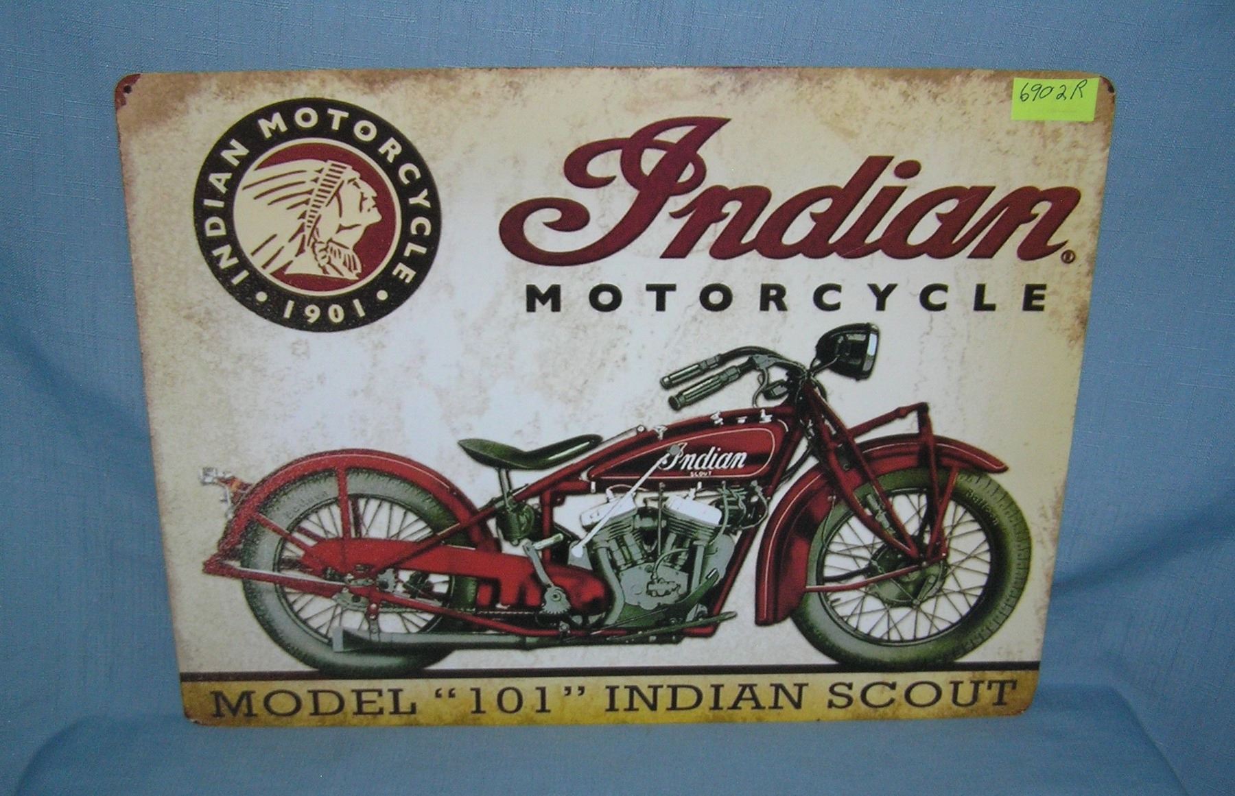 Indian Motorcycles model 101 Indian Scout retro style advertising sign printed on PVC hardboard these signs are auctioned for their decorative and display purposes 12 inches by 16 inches est. value $50.00-$60.00