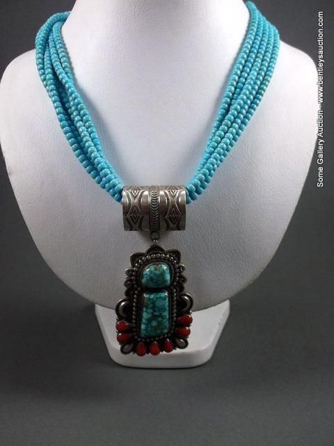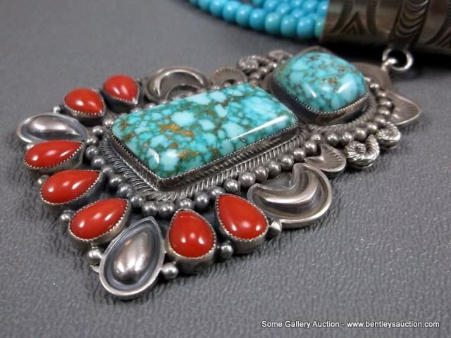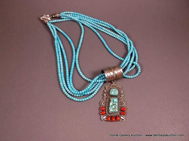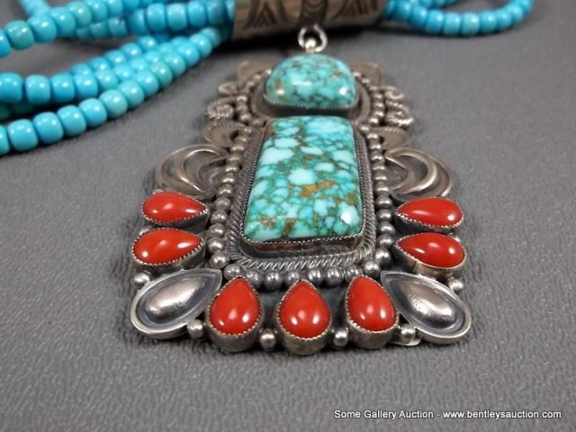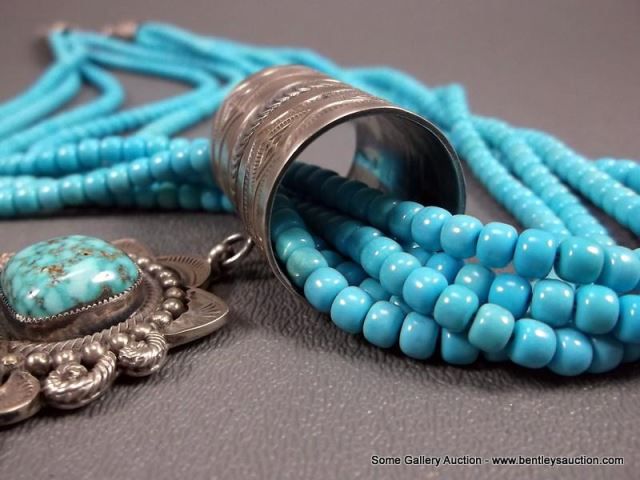 Indian Mountain Multi String Turquoise Bead Necklace w/ Sterling Silver Clasp and Turquoise/ Red Sto