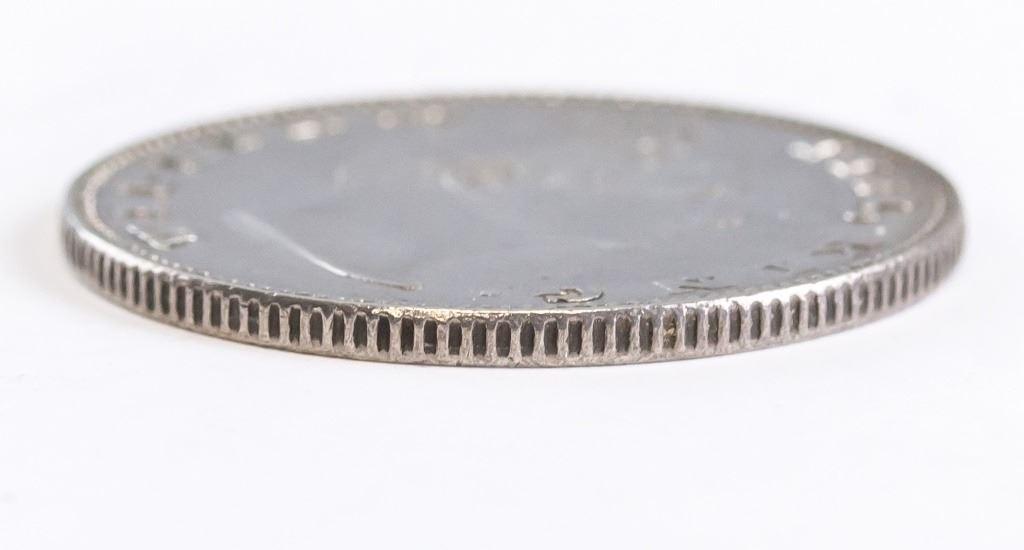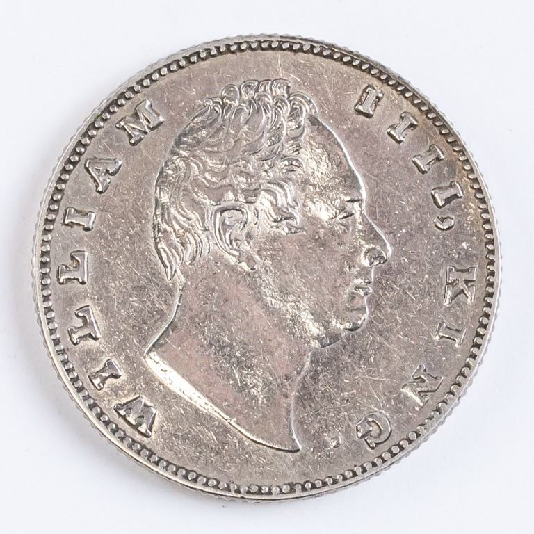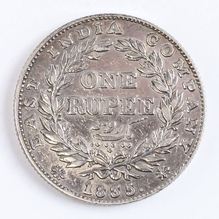British India coin. Obverse: Bust of King William facing right. "WILLIAM IIII, KING". Reverse: Value within wreath in English and Urdu. "EAST INDIA COMPANY / ONE RUPEE / 1835". Diameter: 3 cm. 11 grams.