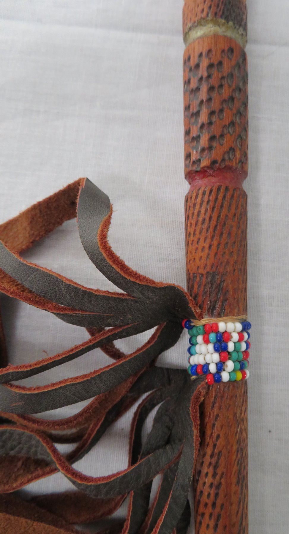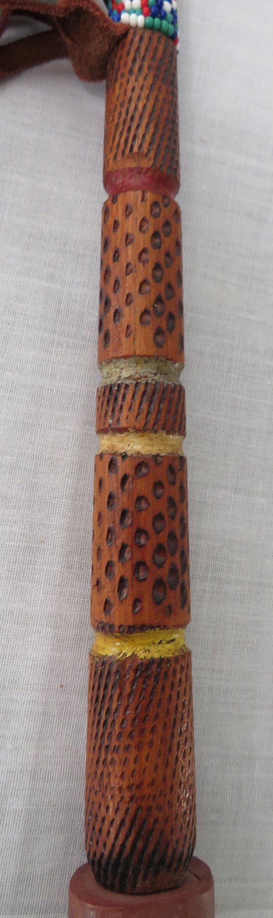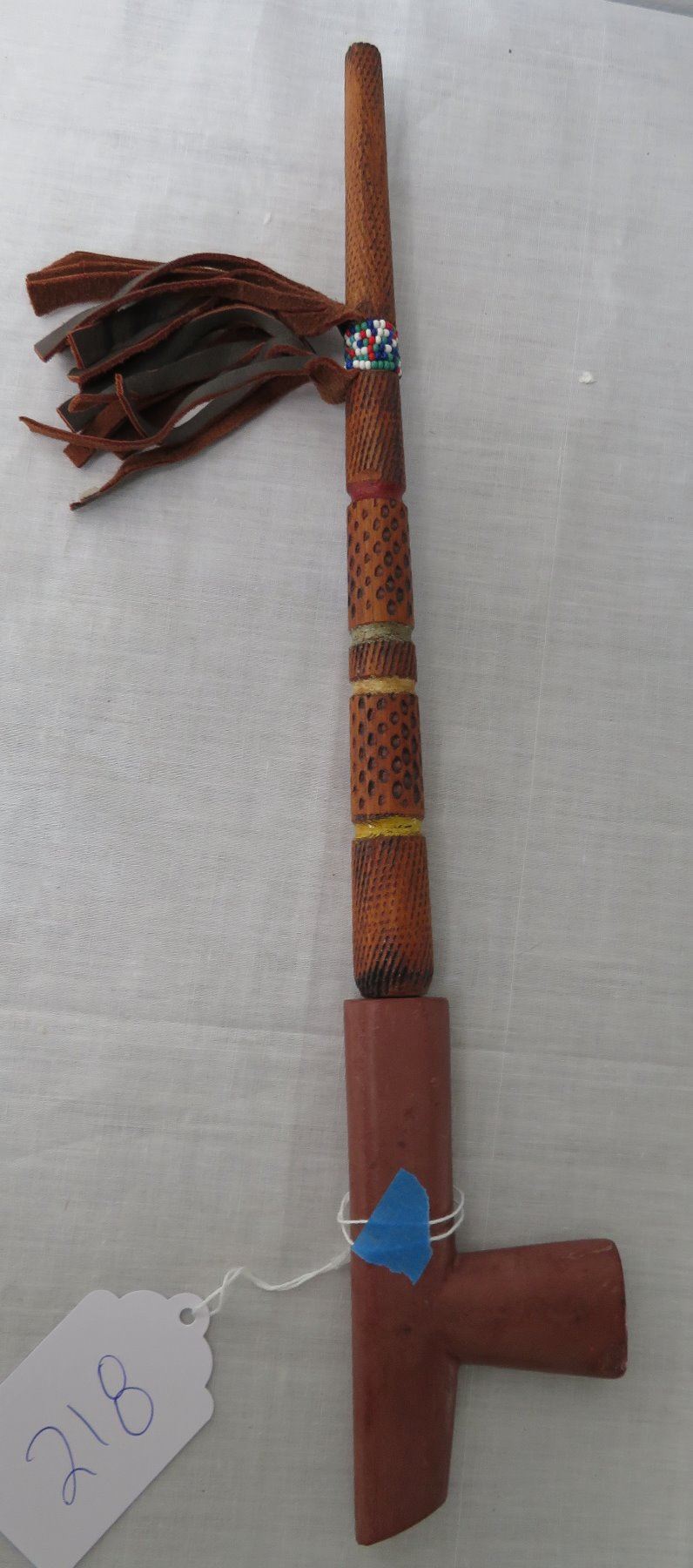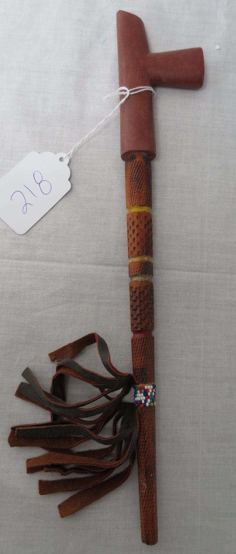 Indian Peace Pipe, c. 1950s. Made of wood, catlinite and beads, the item measures 2 3/4" x 16". Sioux, Minnesota. Minnesota pipe stone pipe is likely never to have been smoked. Condition: Good, see images. Shipping: $20.00 w/insurance and signature.