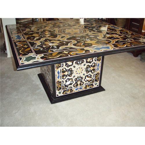 Dining size table, India, Pietra dura marble, ca 2000, 59? sq. x 29.5?. Elaborate multicolor inlays of floral urns, musical and weaponry crests, birds and beasts surrounding central medallion, on stand of similar design.