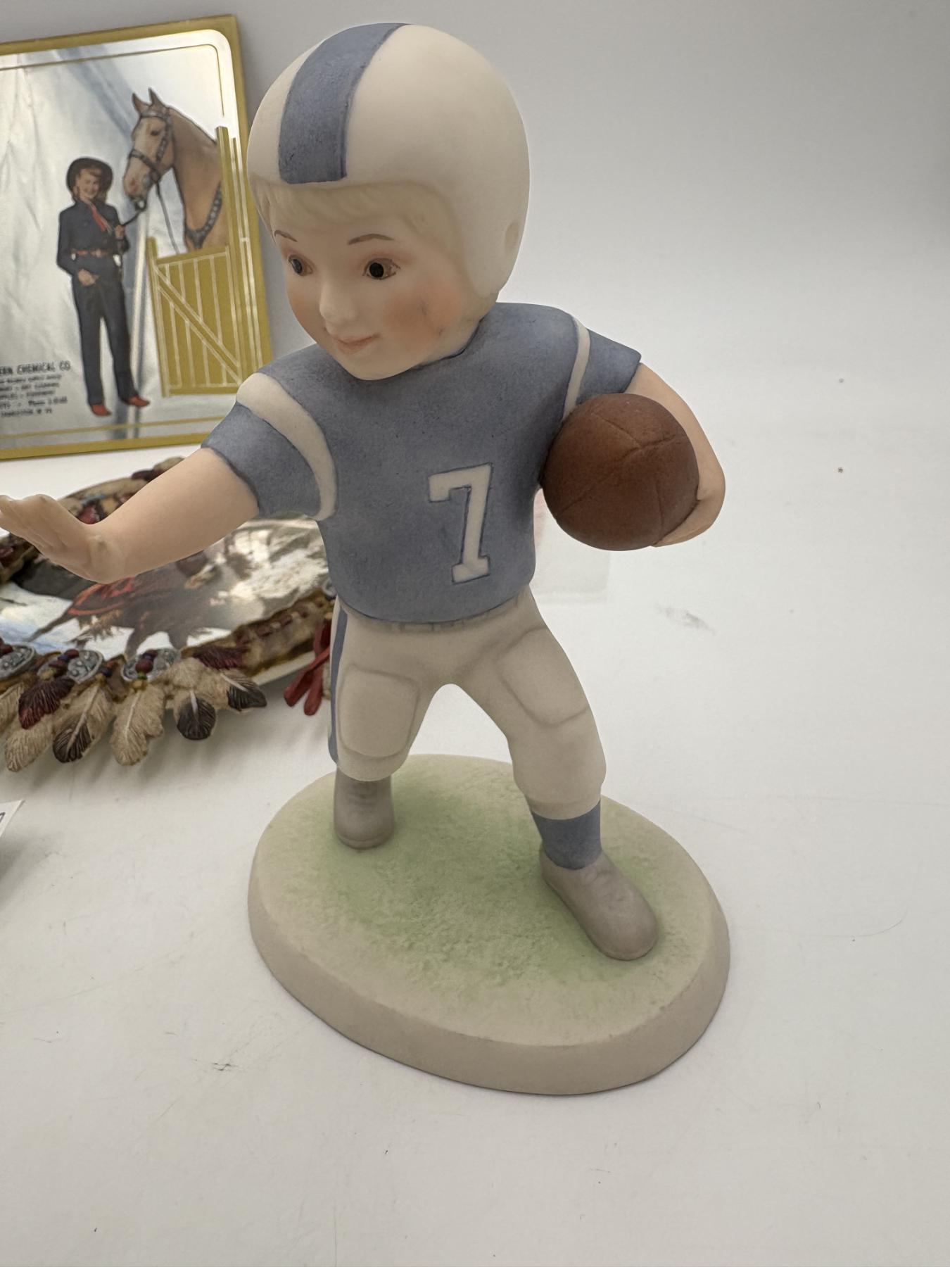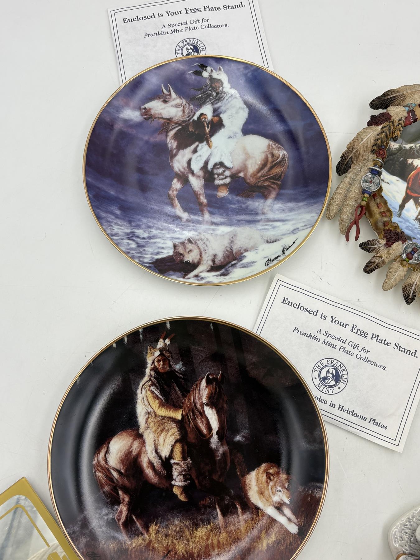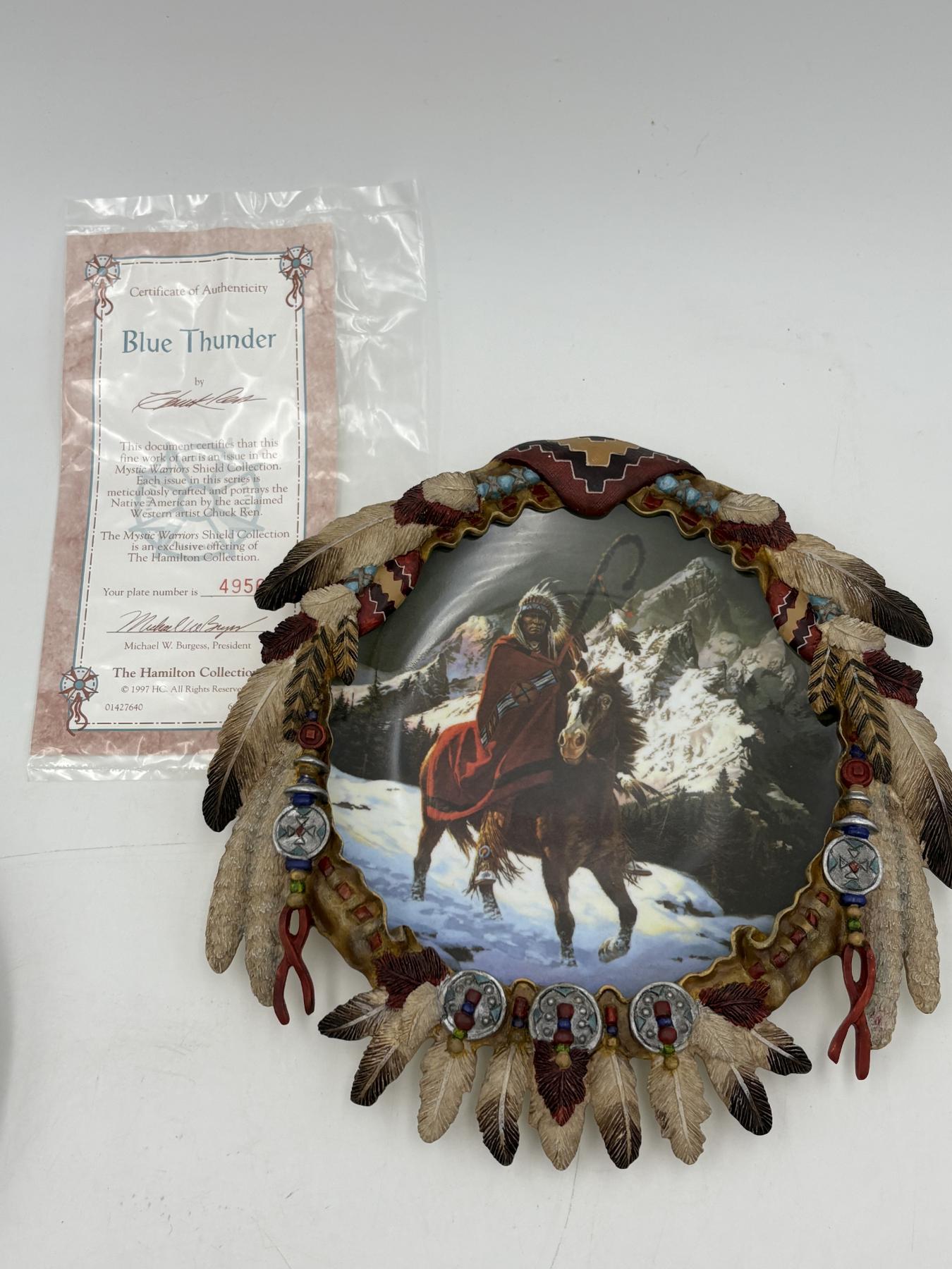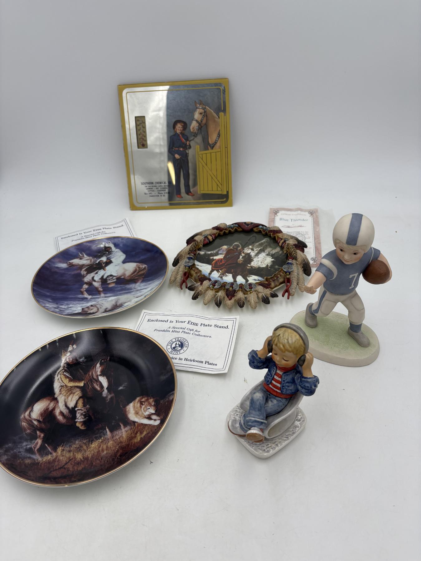 Indian Plates, 2 Figurines & Southern Chemical Co Thermometer - Plate Stands - Blue Thunder Plate- Hamilton Collection