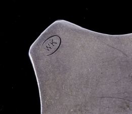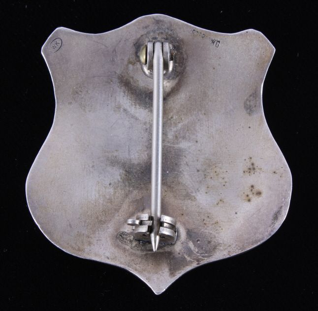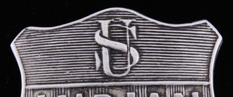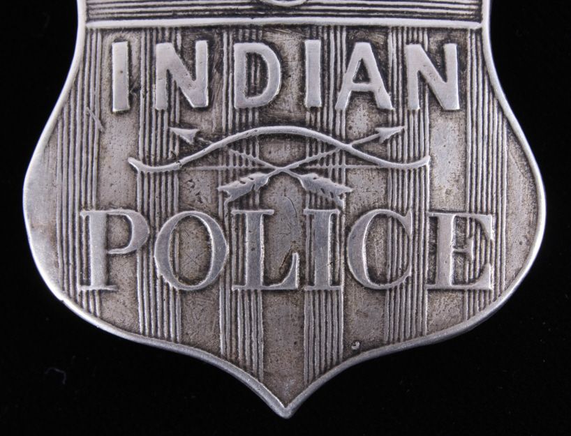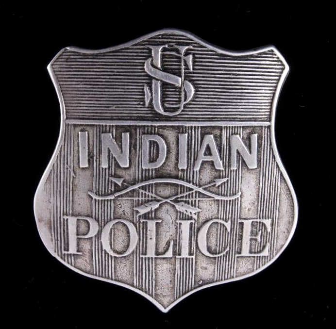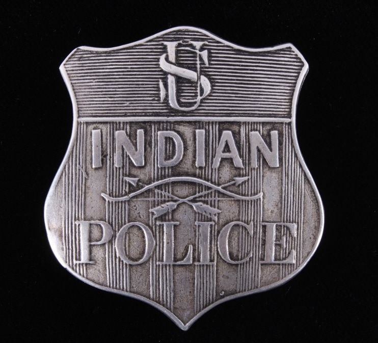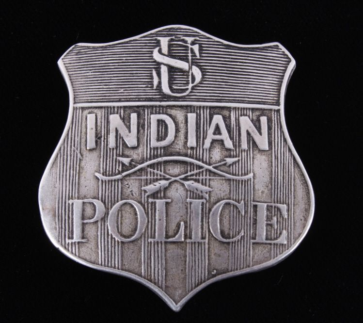The piece is a very rare and historic original Indian Police badge from circa 1880-1890. This is a wonderful example of one of the most sought after and desired lawman badges. This is a very early original United States Indian Policeman shield badge. The badge features the “crossed arrows”. The reverse shows a clean back with the original pin and marked “WK (surrounded by an oval)” and “Sterling”. Other badges that have sold have shown a lesser quality than this piece. Collected in Montana. Measures 1 7/8"x2"