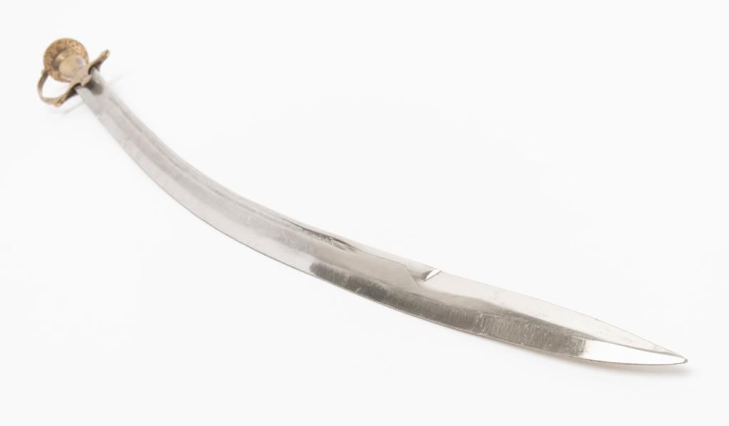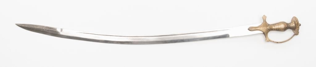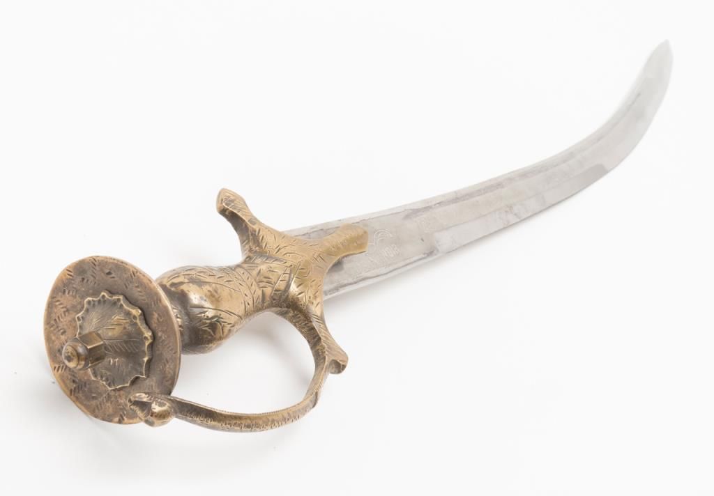 Indian Presentation Sword with 30” etched blade. The sword is in overall very good condition with a 30” curved, etched blade and brass hand guard. The blade shows sharpening and is marked “Made in India” but is otherwise clean, with no scabbard.Est.: $150-$300.