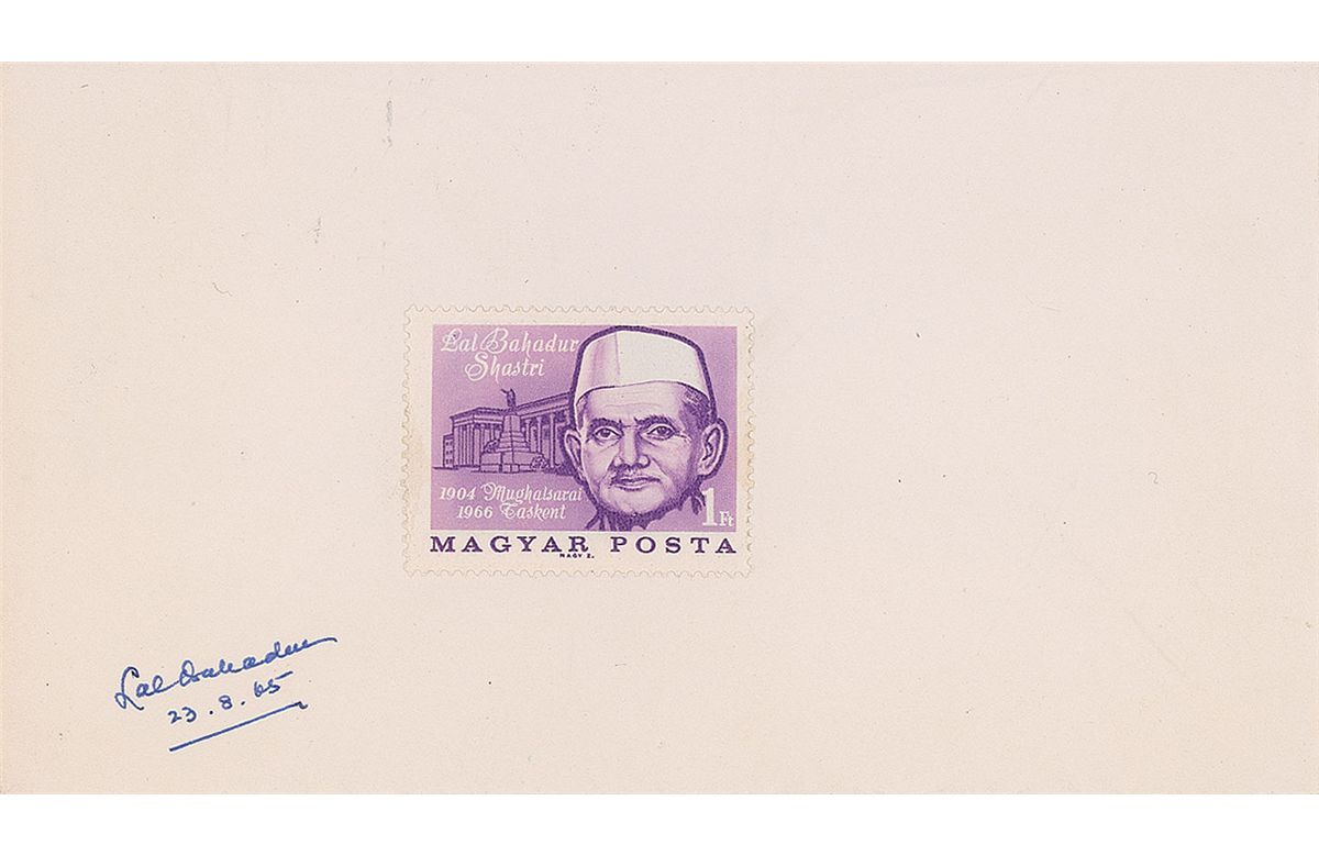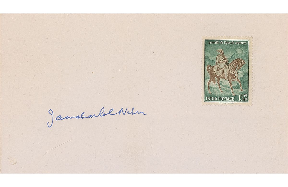 Pair of uncancelled covers bearing affixed Indian postage stamps, individually signed in fountain pen, “Jawaharlal Nehru” and “Lal Bahadur, 23.8.65.” In overall fine condition.