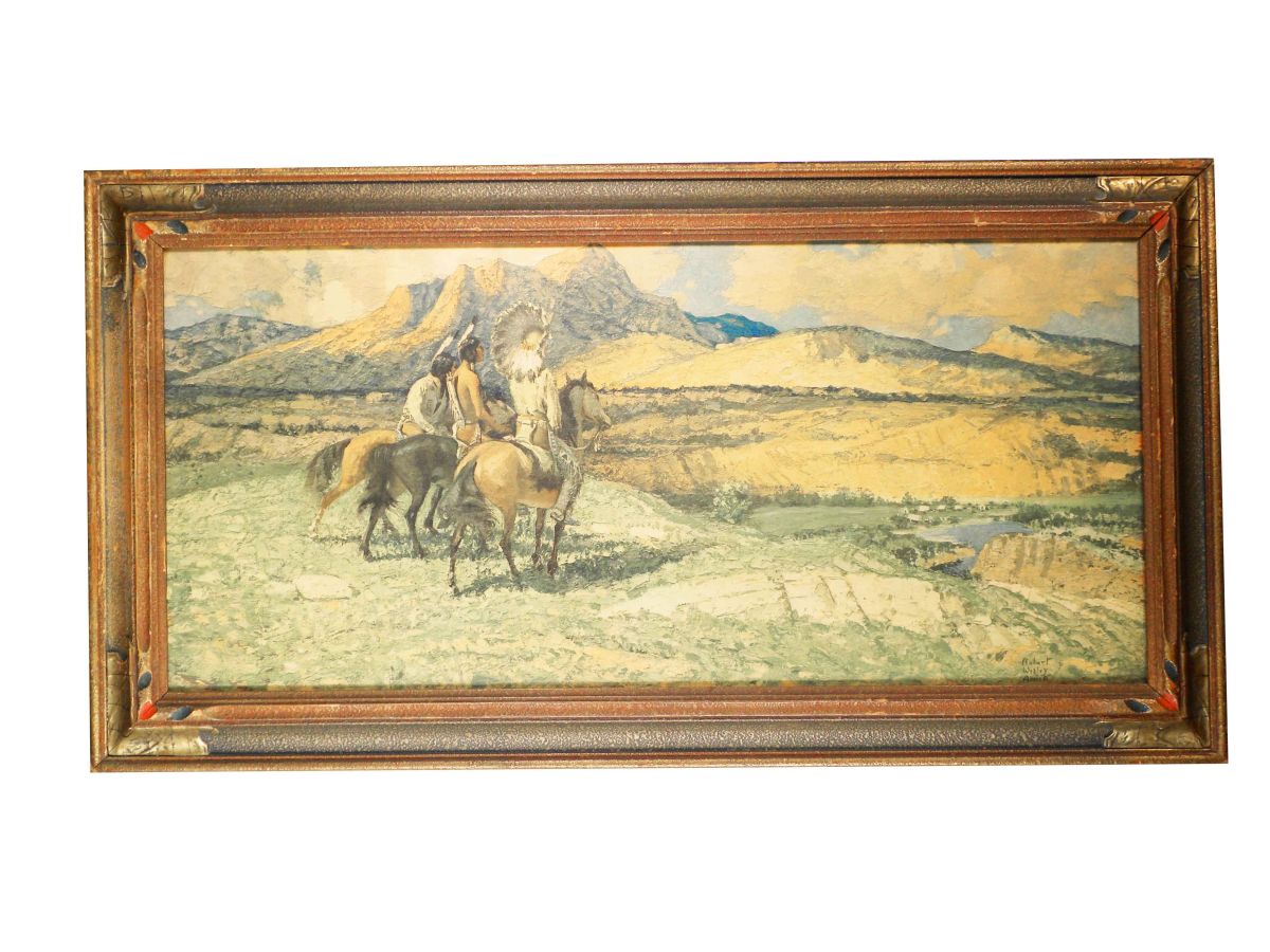 Print of Three Indians overlooking wagon train camp. Robert Wesley Amich, artist. Original frame, excellent condition. 34 X 18 1/2 inches overall.