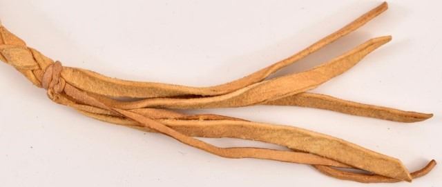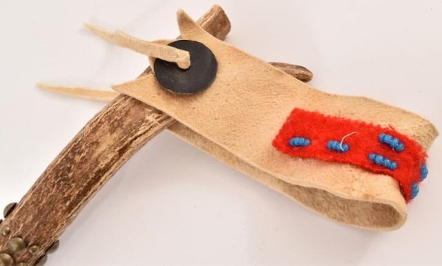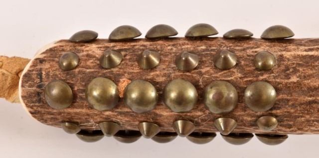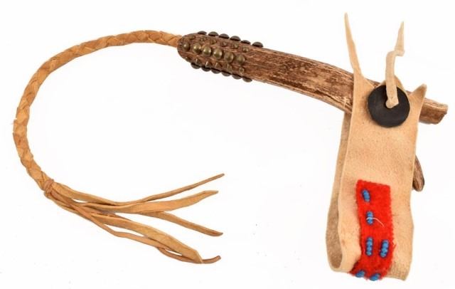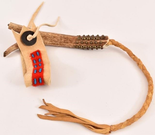 Studded antler handle quirt, with 20" braided rawhide lash, and beaded trade cloth.