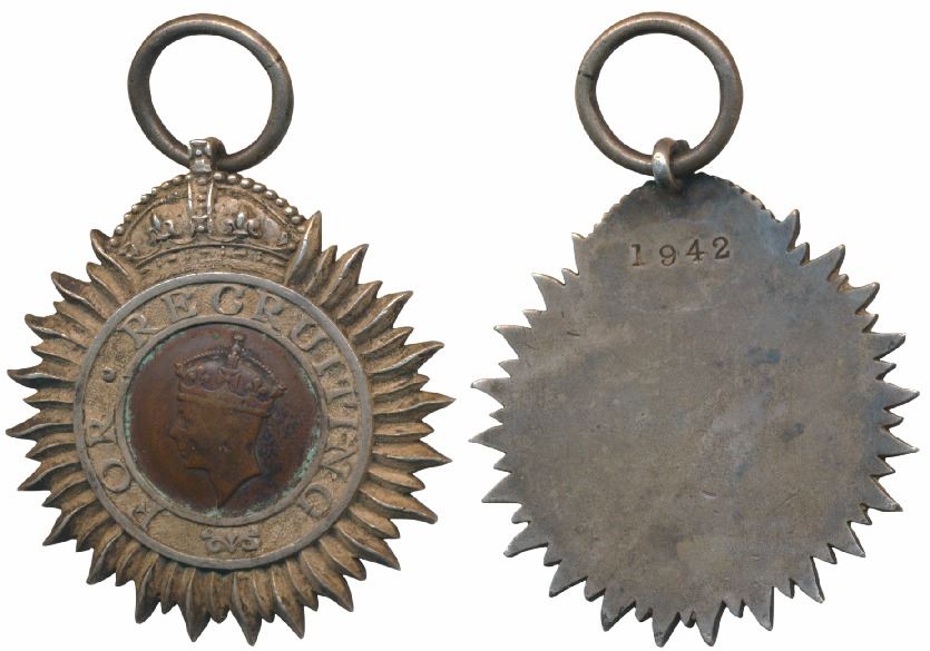 Indian Recruiting Badge, George VI, Silver Medal, a multi rayed badge surmounted by a crown, with a copper disc bearing the bust of George VI, For Recruiting around, rev. 1942 (Pudd (1987) 980.10.2, MYB 351). About Extremely Fine, Scarce.