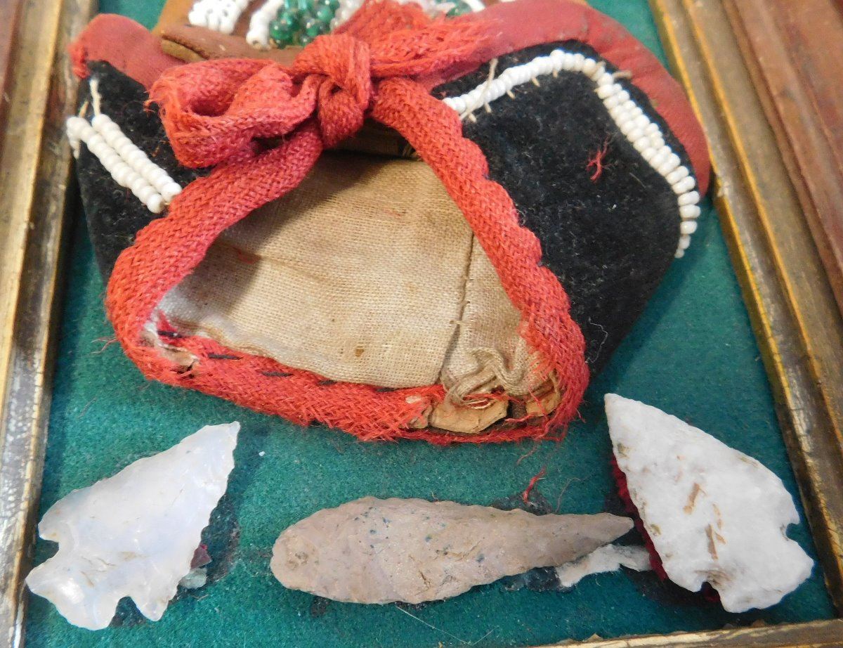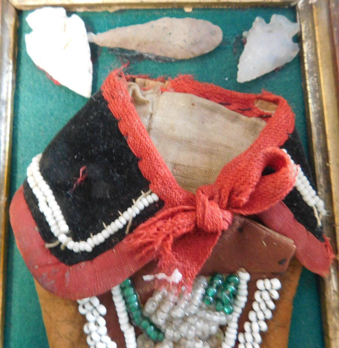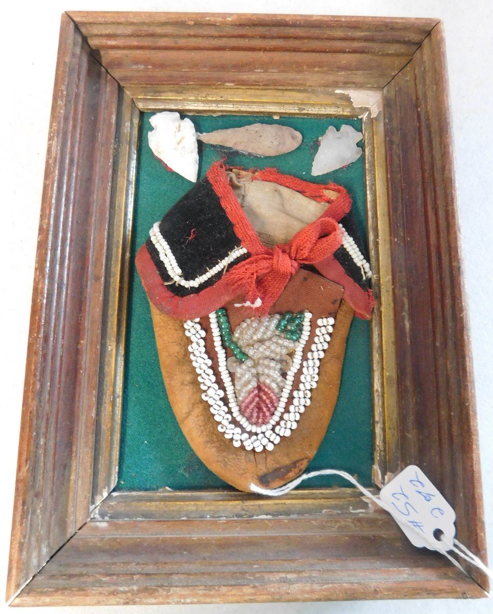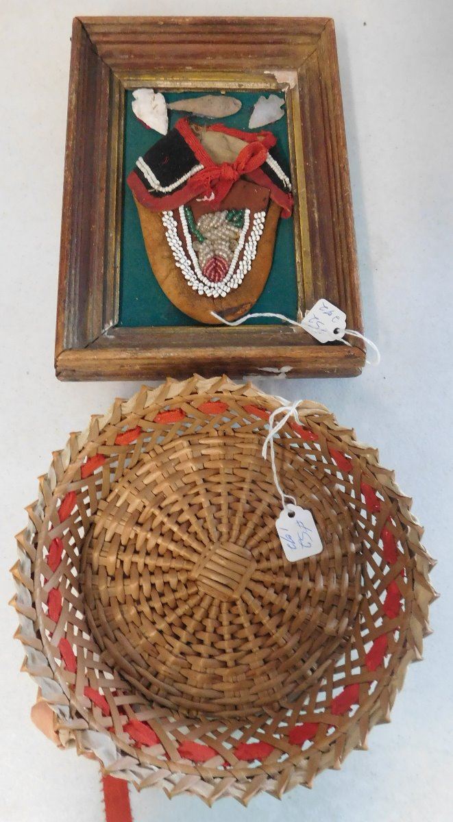 Indian Relic Collection, circa 1890s. Made of flint, leather, beads and wood, the basket is 7" x 7" x 2.5" and the frame is 8.5" x 6" x 2". Minnesota, USA. Basket is dated 1890, frame with mocc and arrowhead points. Frame included. Condition: Minor break on basket, see images. Shipping: $22.50 w/insurance and signature.