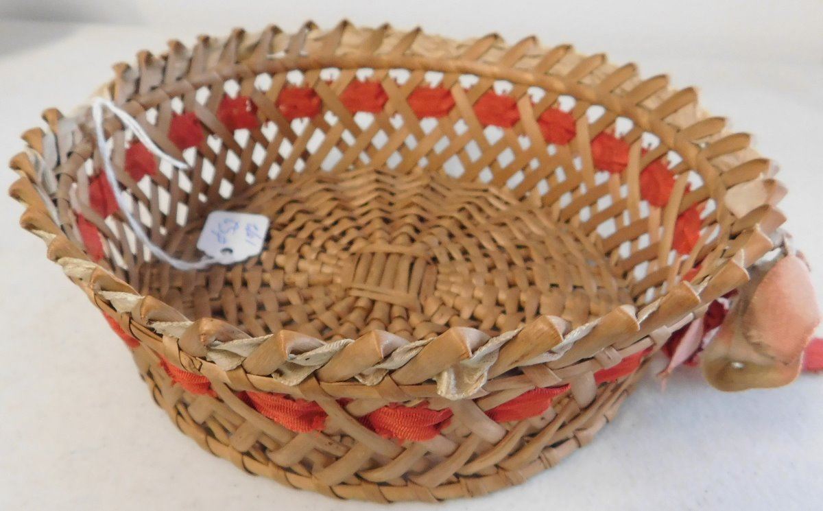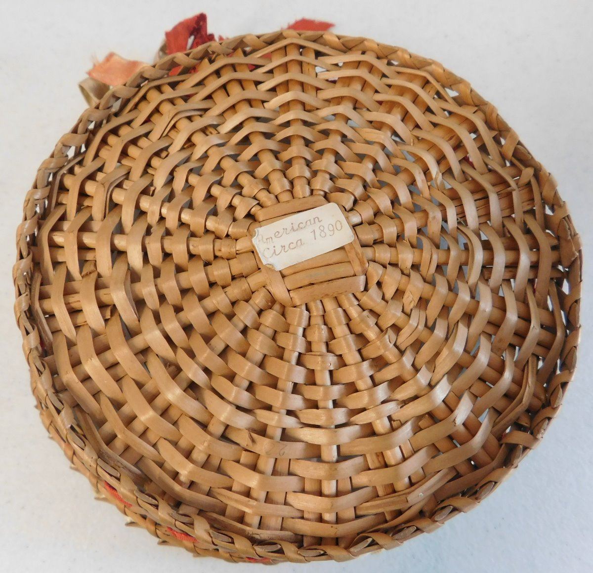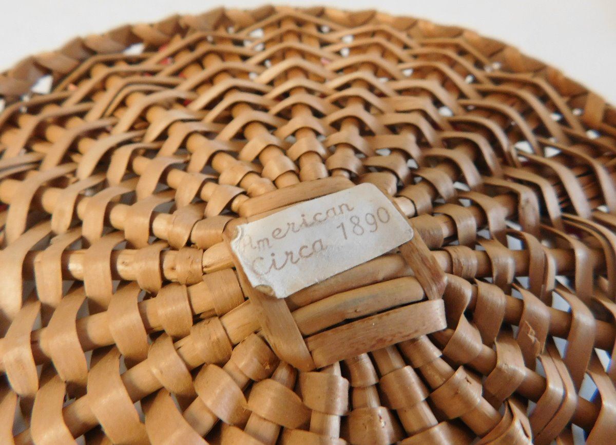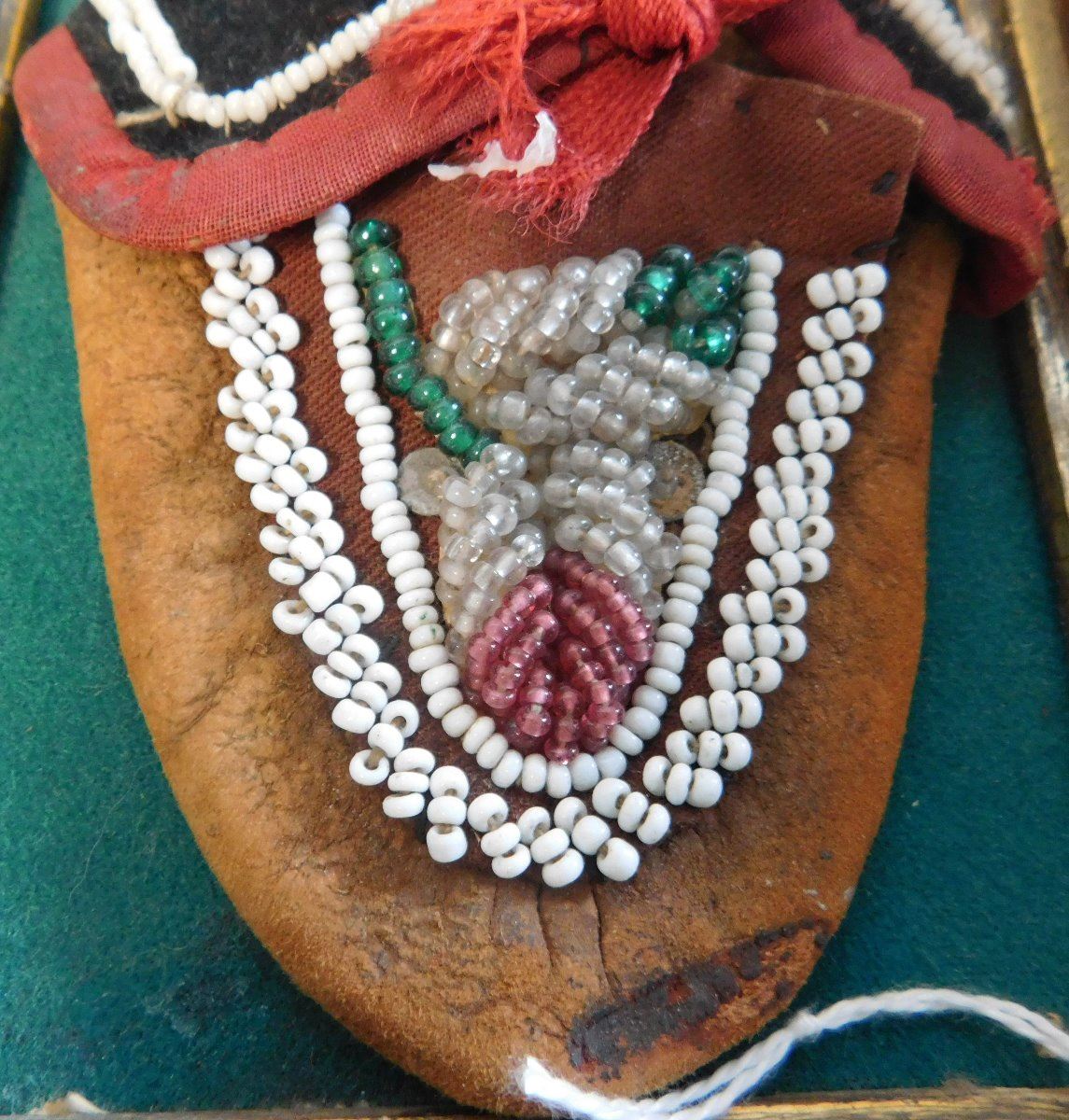 Indian Relic Collection, circa 1890s. Made of flint, leather, beads and wood, the basket is 7" x 7" x 2.5" and the frame is 8.5" x 6" x 2". Minnesota, USA. Basket is dated 1890, frame with mocc and arrowhead points. Frame included. Condition: Minor break on basket, see images. Shipping: $22.50 w/insurance and signature.