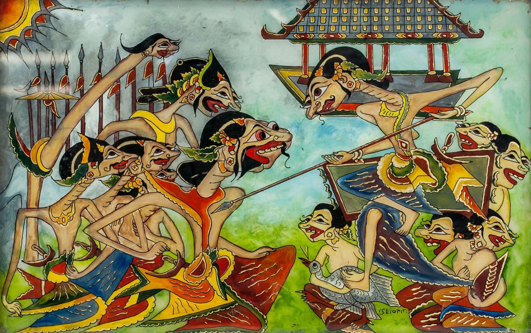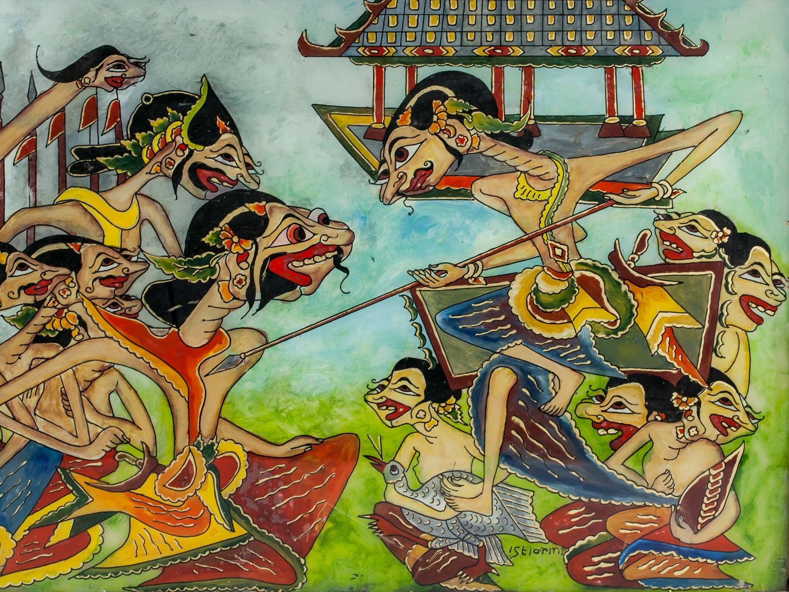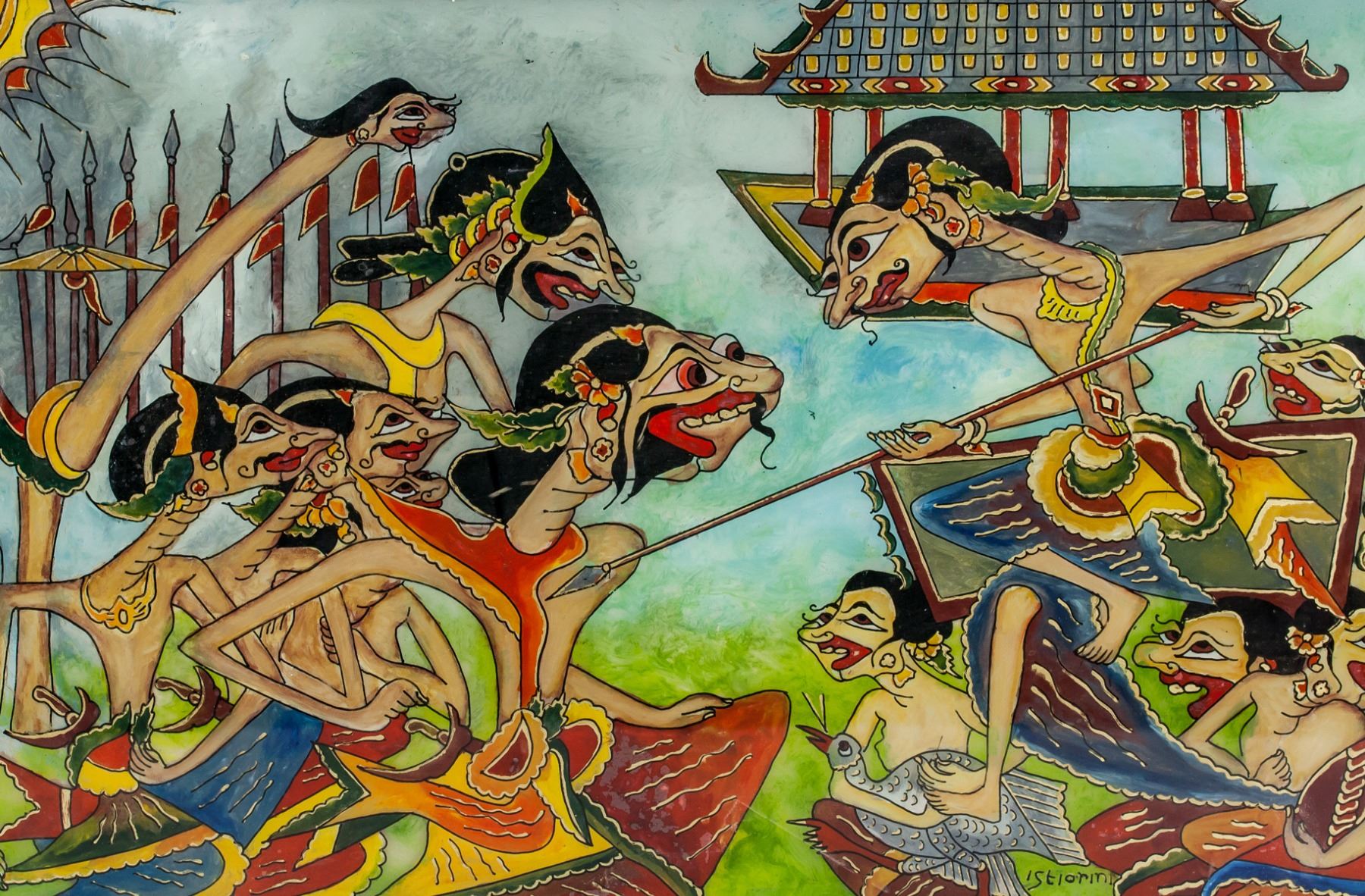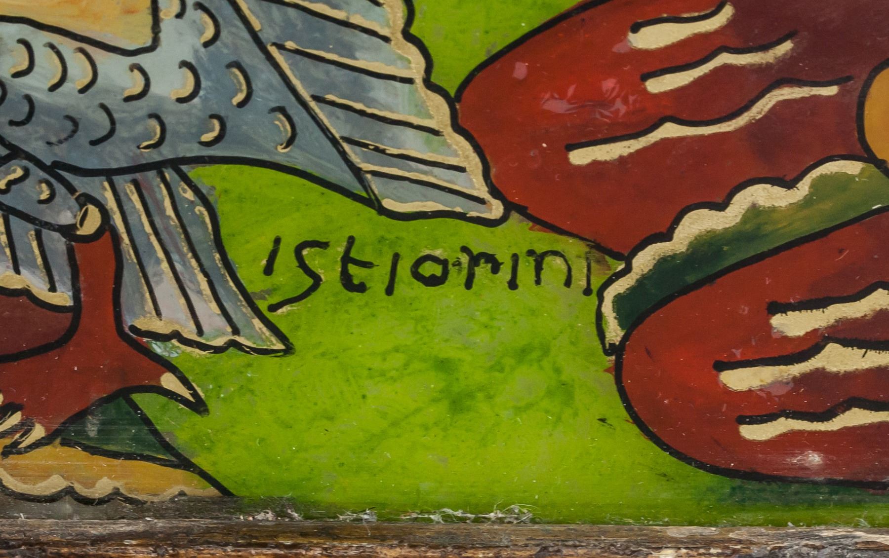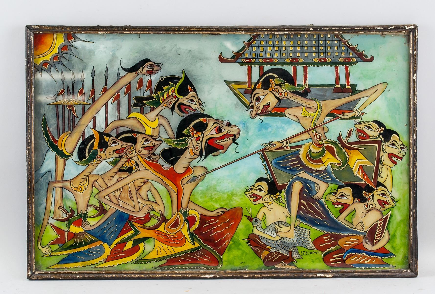 Indian reverse painting on glass, framed. Signed Istiorimi. 34.5 x 54.5 cm (13.5 x 21.5 in). Frame: 37.5 x 57 cm (14.5 x 24.5 in)