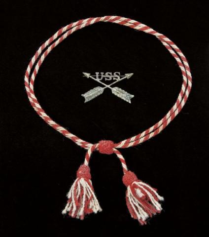Indian Scout lot consisting of Pin, hat, cord, and reprinted photo. Pin and cord appear genuine. Est: $700 - $1,500