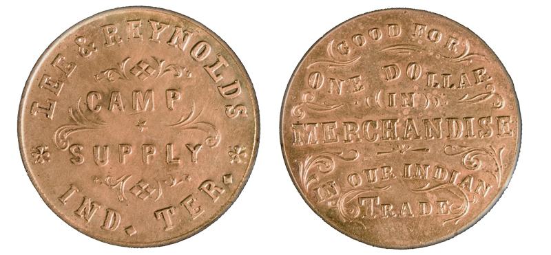 Obverse: Lee & Reynolds / camp / supply / Ind. Terr.; reserve: good for / one dollar / in merchandise / in our Indian / trade. Brass, 25mm. Extremely fine condition.