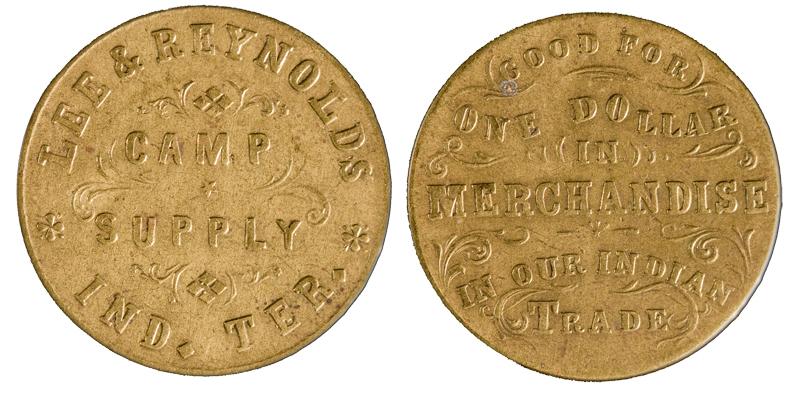 Obverse: Lee & Reynolds / Camp / Supply / Ind. Ter. Reverse: Good for / one dollar / in / merchandise / in our indian / trade. Brass, 26mm. Extremely fine condition.