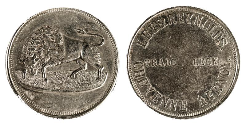 Obverse: left facing buffalo; Reverse: Lee & Reynolds / trade check / Cheyenne Agency. 30mm, fine condition.