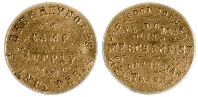 Obverse: Lee & Reynolds / camp / supply / Ind. Terr.; reserve: good for / one dollar / in merchandise / in our Indian / trade. Brass, 25mm. Fine condition.