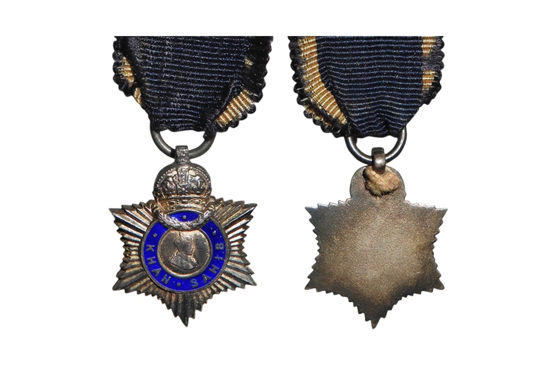 India, Indian Title Badge Miniature - Khan Sahib, George V issue, right-facing bust. Silver, 4.40 grams, ribbon. Very Fine+, Scarce.