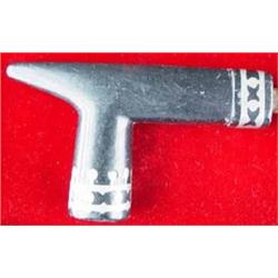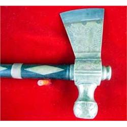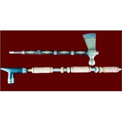 Inlaid Tomahawk/Pipe & Pipe with Inlaid Pewter Steatite Head. In Locking Display Case. Damascus Iron & Brass Tomahawk/Pipe. 16" Long, Pipe 22" Long. Estimate $3,000 - $4,000.