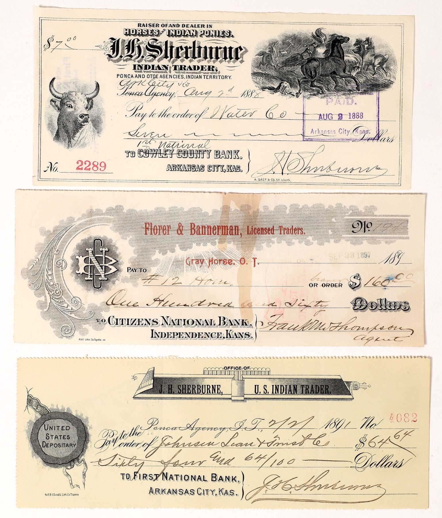Three checks from Indian traders: 1) 1888 check from J. H. Sherburne, raiser of and dealer in horses and Indian Ponies, Ponca and Otoe Agencies; vignettes of horses and a steer. 2) 1891 J. H. Sherburne, U. S. Indian Trader. 3) 1897 check from Florer & Bannerman, Licensed Traders, Gray Horse, Oklahoma Territory.
