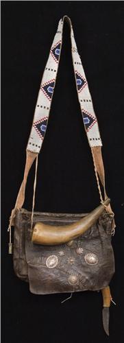 Indian Used Hunting Bag. Leather bag decorated with silver conchos and beaded strap. Has nice powder horn and patch knife attached. 19th Century. Good condition. (est $2,000-3,000)